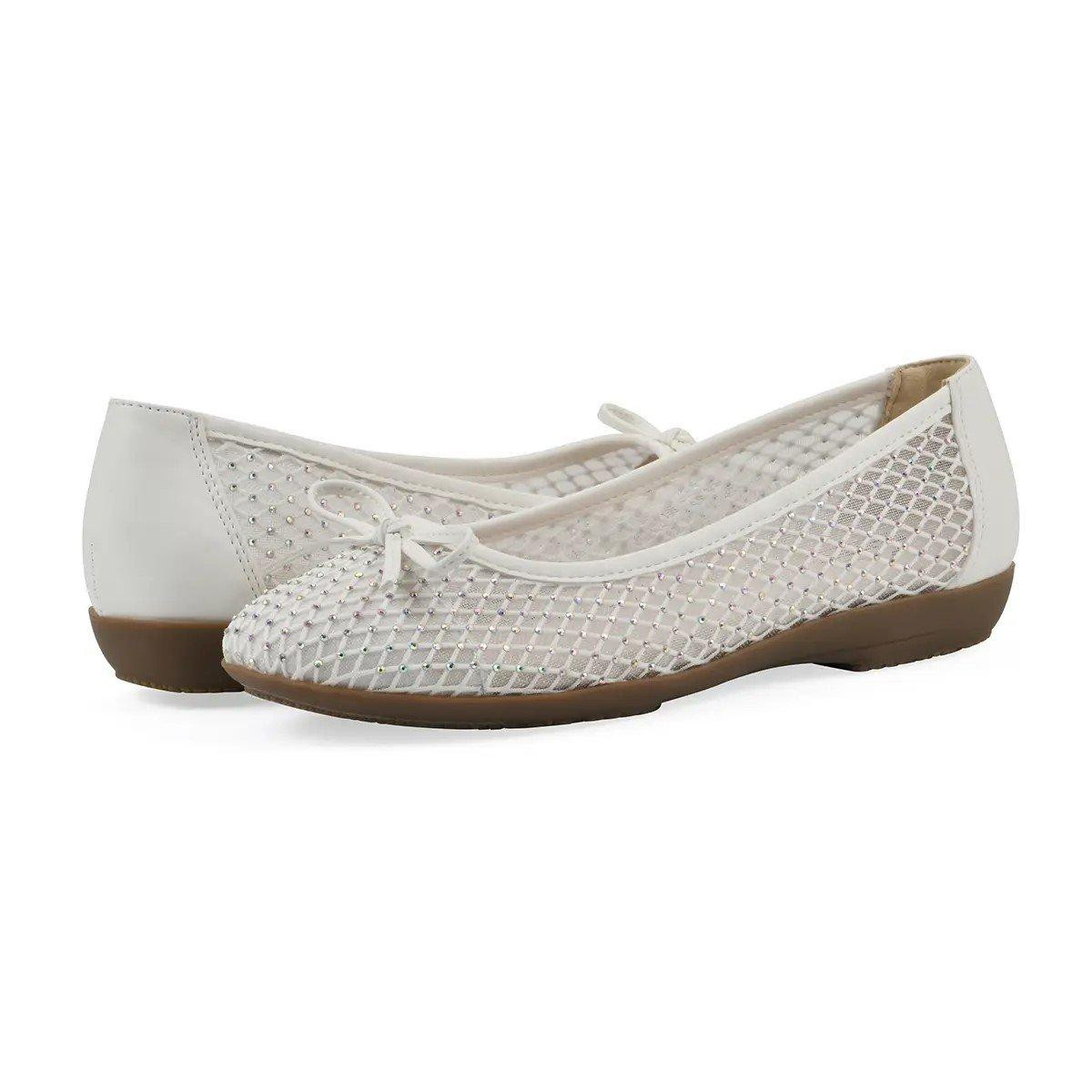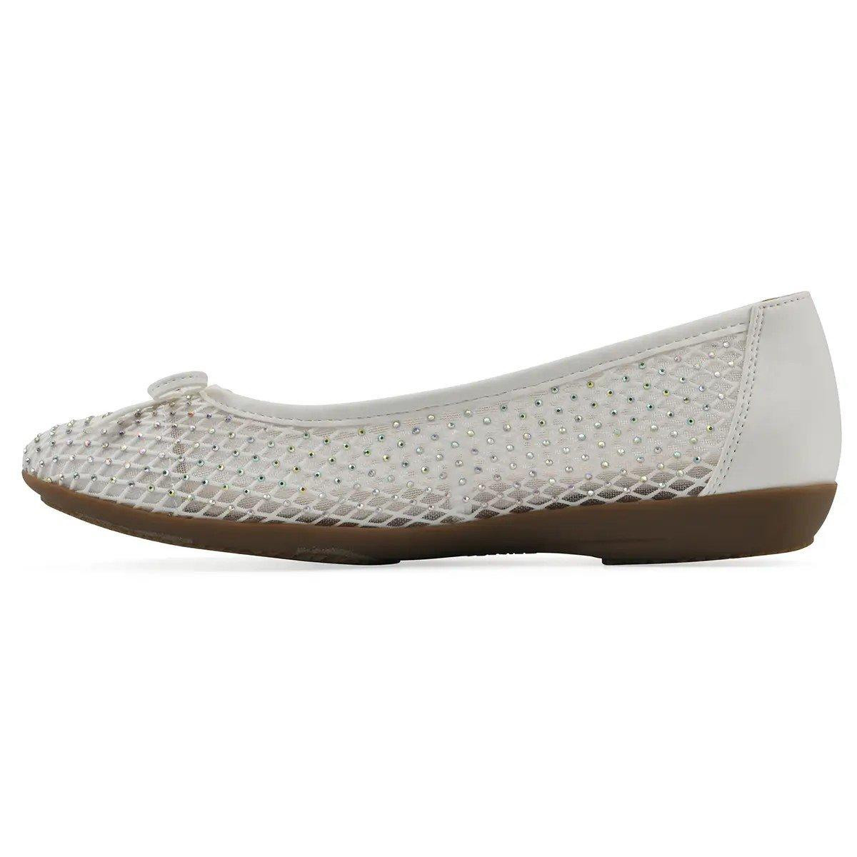 . Featuring a hint of sparkle and a delicate bow detail, this flat is designed to elevate your wardrobe without sacrificing comfort. A cushioned insole ensures all-day comfort, while the subtle embellishments add the perfect touch of flair.