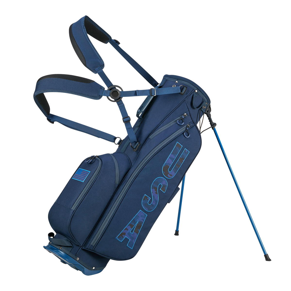 This USA Golf Bag is the perfect intersection of comfort & versatility. Features 8in 4-way top with molded handle, providing easy maneuverability on the course.Quick-action stand system.TPR grab handle and lower trunk handle.6 Pockets:1 large side pocket, 1 velour-lined valuable pocket, 1 large zip-off ball pocket, 1 small accessory pocket, 1 large side pocket, and 1 large open cooler pocket.Comfortable Multi-strap carry with Self Balancing Tech. Fixed Towel, Glove and Umbrella Attachments.