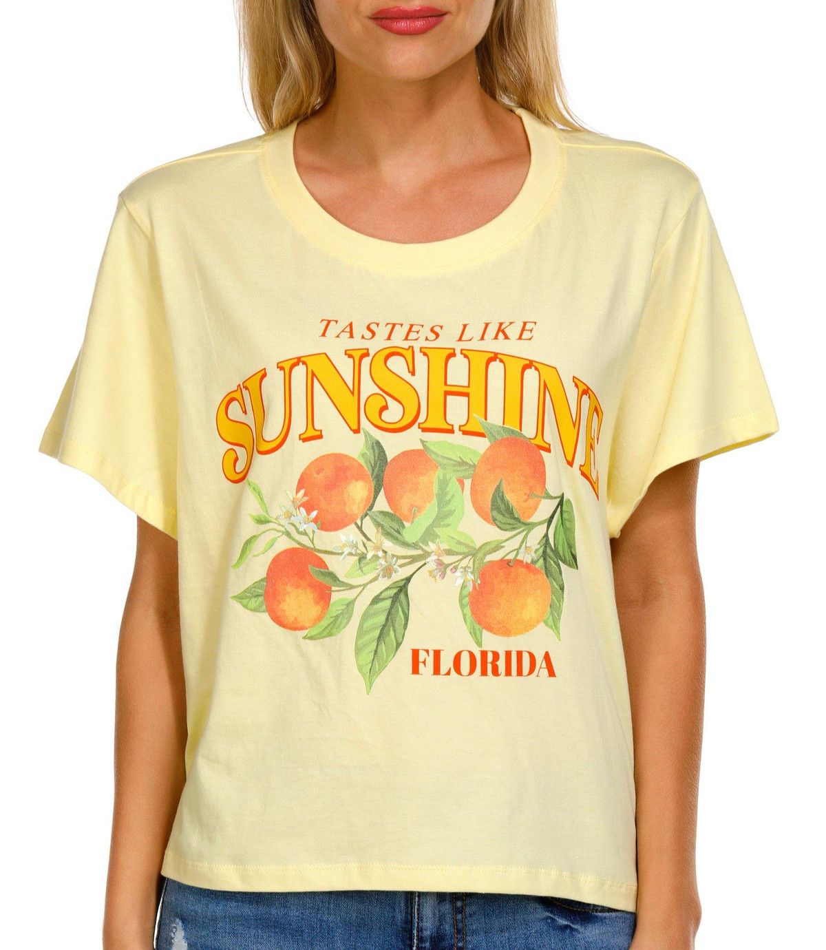 Introducing the Juniors Sunshine Oranges T-Shirt, made from 100% cotton for a soft and comfortable feel. This delightful tee features a crew neckline and short sleeves, with a 20-inch length for a perfect fit. The front showcases a vibrant orange fruit graphic design accompanied by the Tastes Like Sunshine script, adding a cheerful touch to your wardrobe. Ideal for casual wear, this t-shirt combines style and comfort effortlessly, making it a must-have for any junior’s collection.