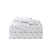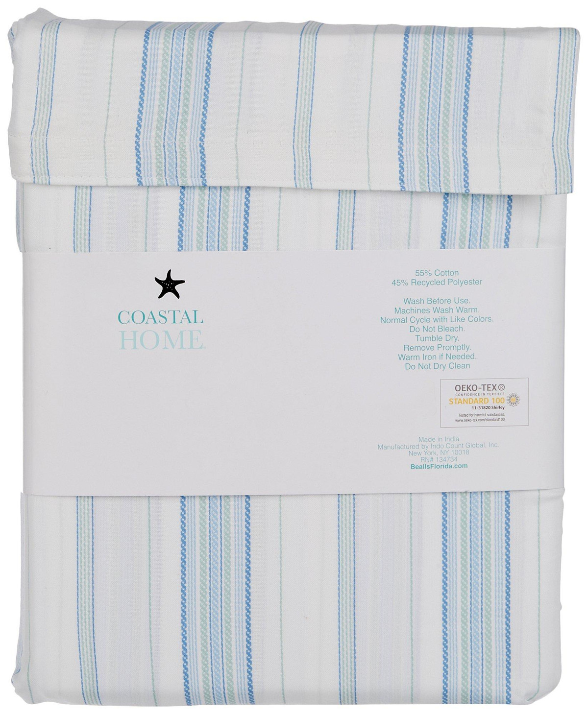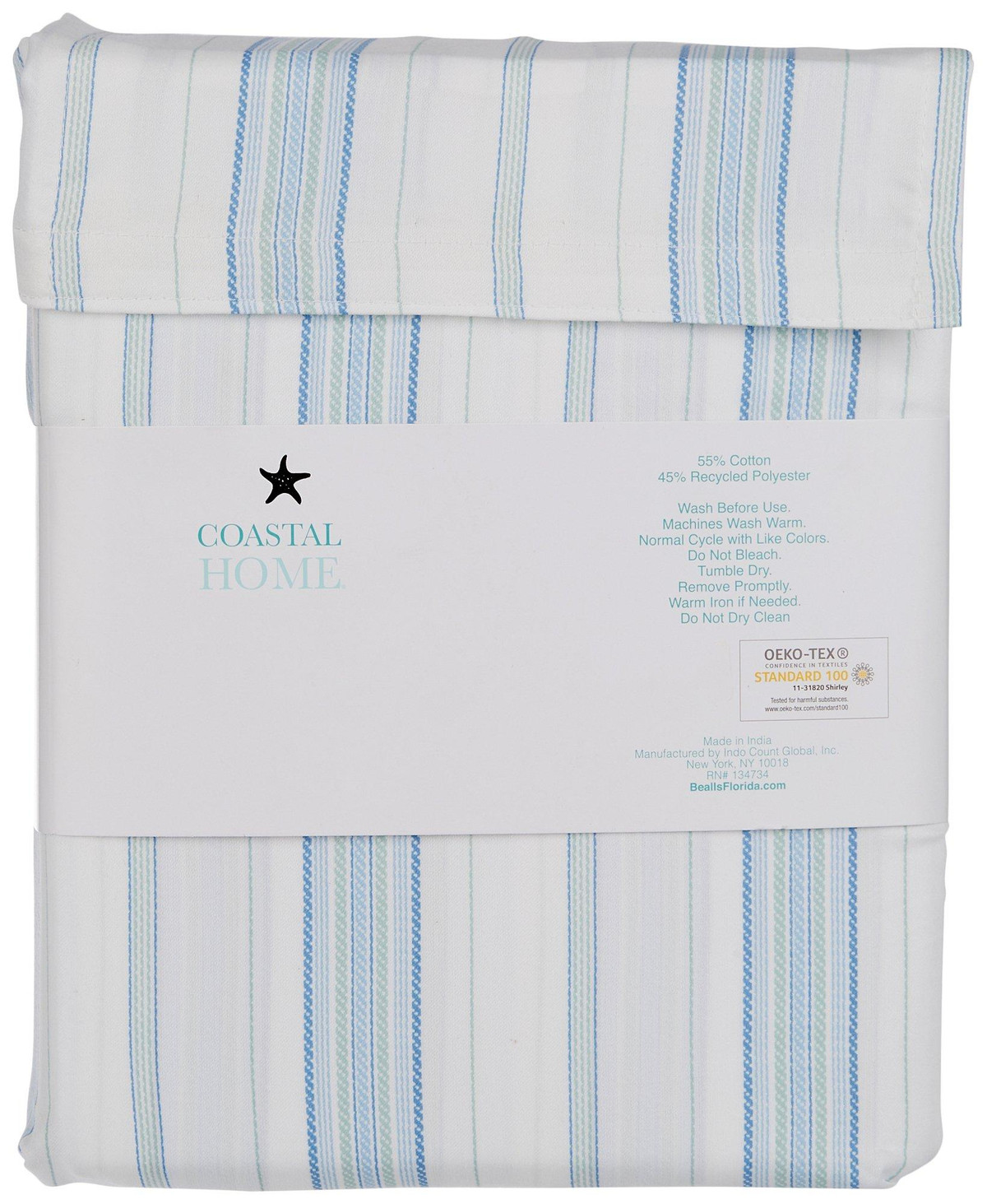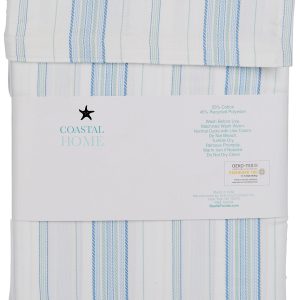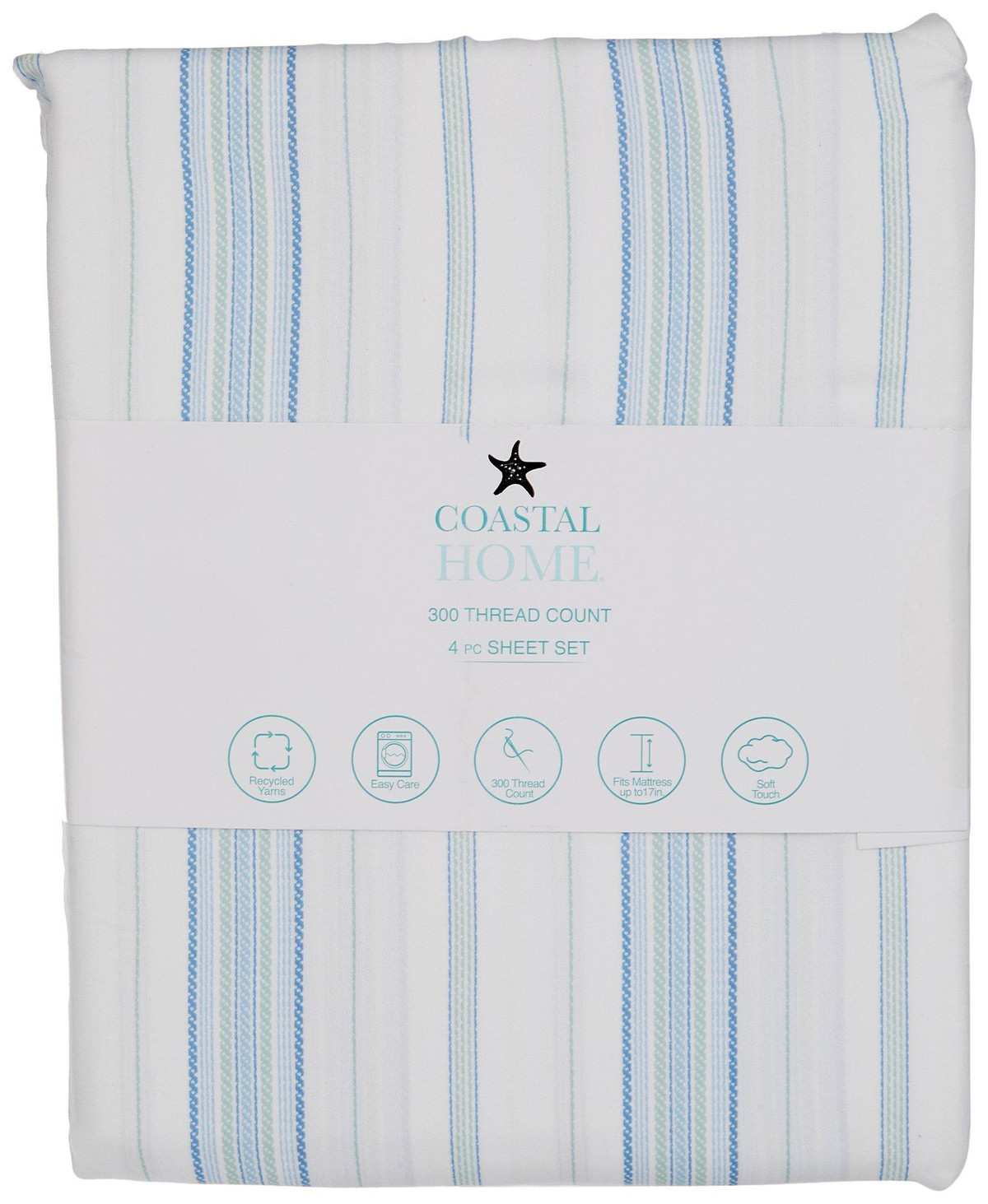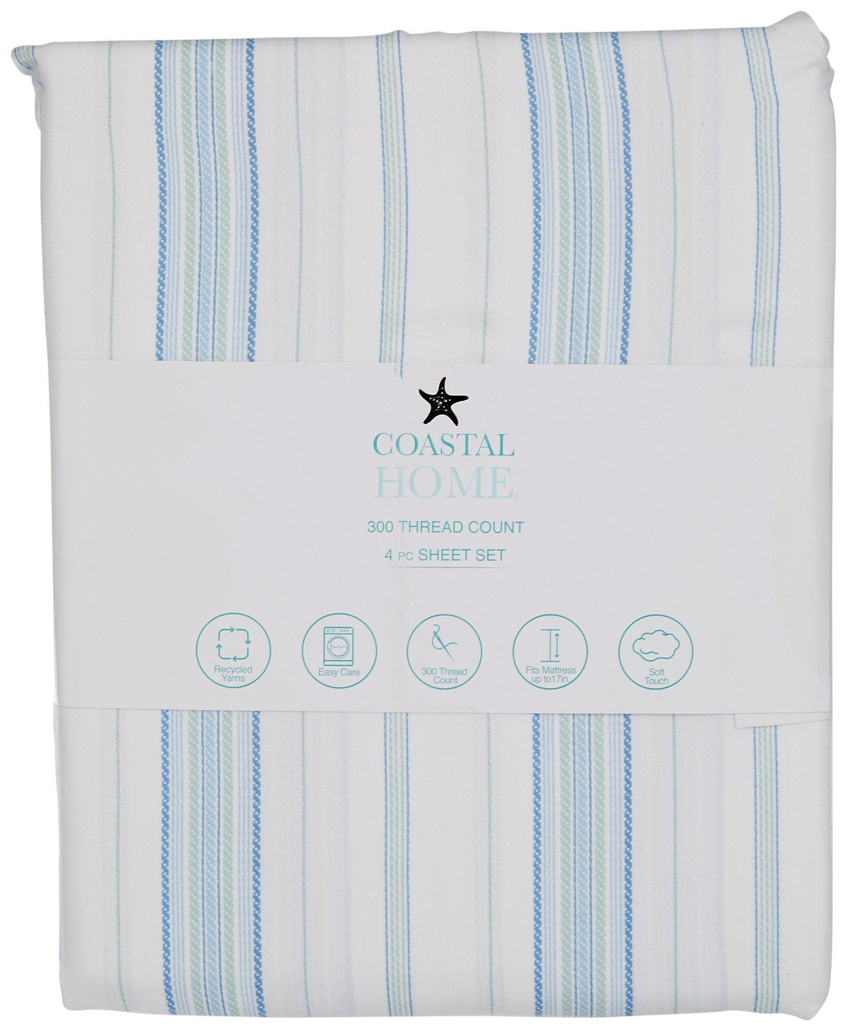 Coastal Home adds a touch of coastal style to your home decoration. This sheet set features a fun spiral stripe design, made with recycled yarns, soft to the touch and fits up to a 17in mattress. 300 thread count. Set includes one fitted sheet, one flat sheet and two pillow shams (one for twin size). Fabrication 55% cotton, 45% recycled polyester.