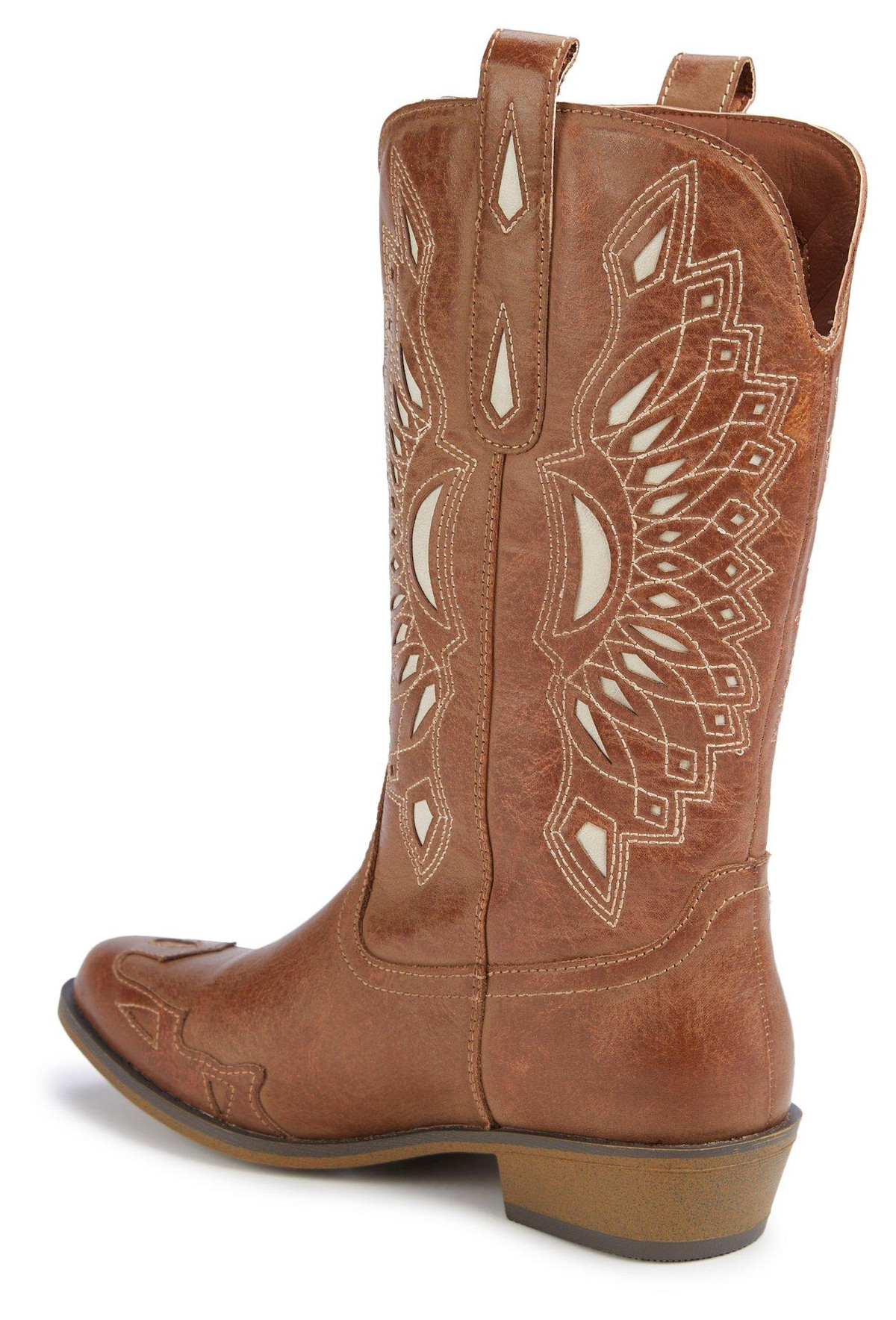 Highlight your country girl style in the Bandelero women’s Western boot. With a faux leather upper and contrast stitch detailing for extra flair, this pull-on boot is cute enough to wear everyday. The padded insole comforts your foot while the block heel is low enough to walk, scoot or dance.