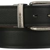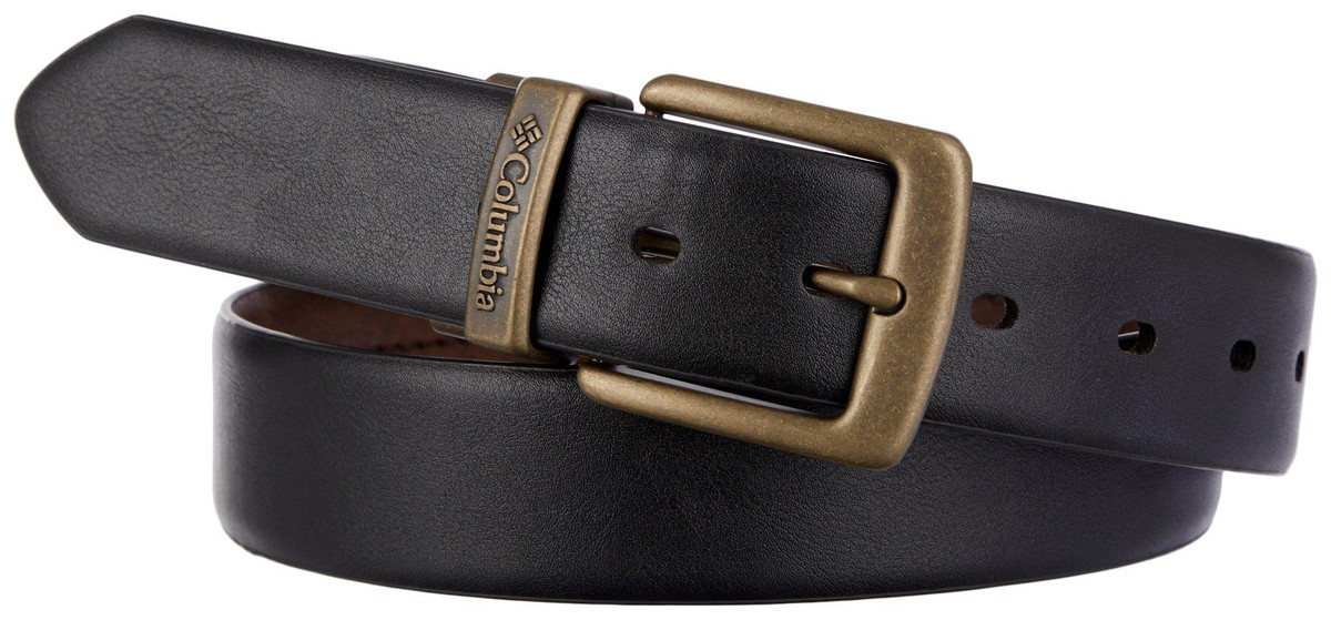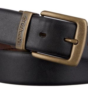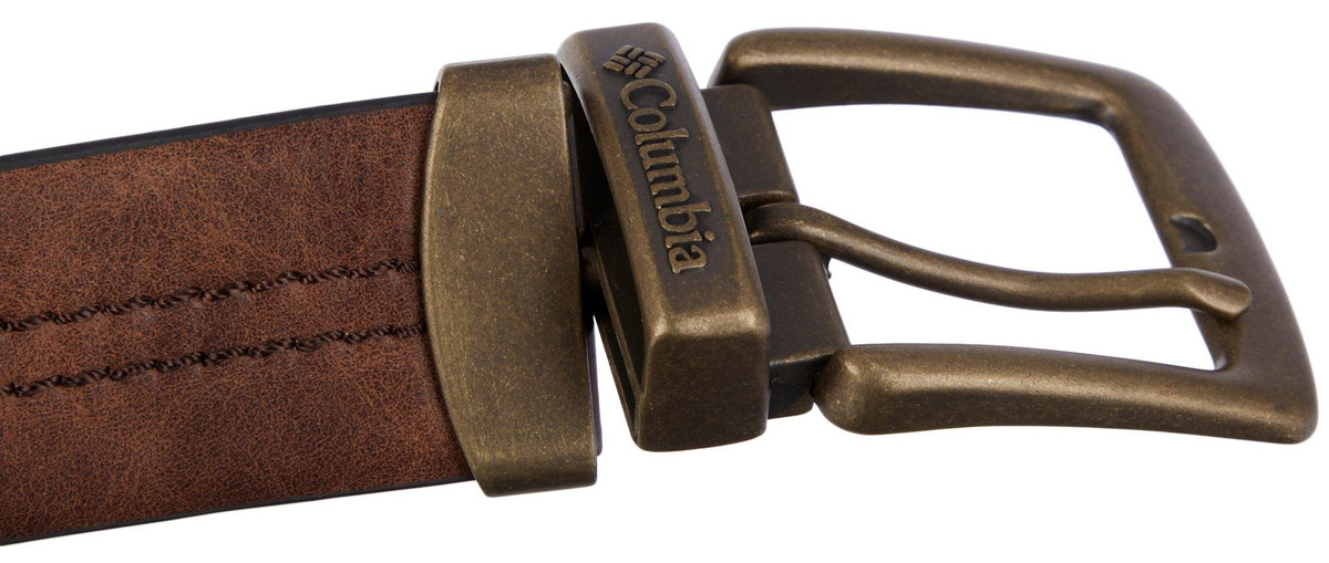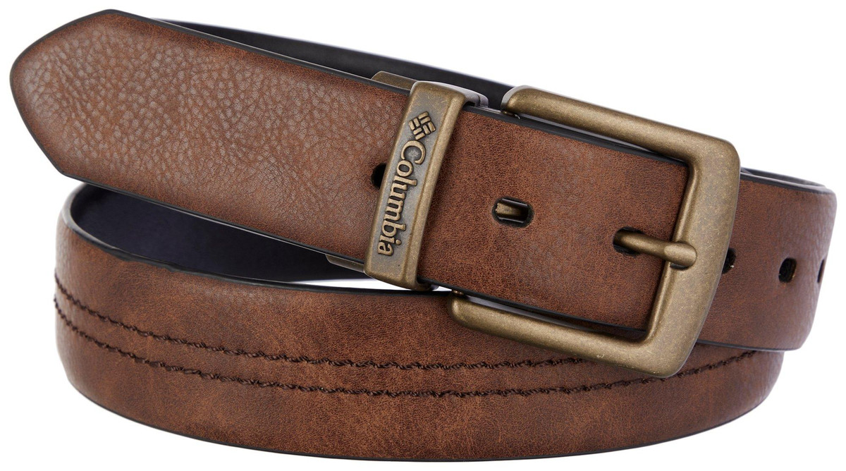 This Columbia Mens Active Stretch Vegan Leather Reversible Belt features a stretch, vegan leather design, stitching detail on one side, a smooth, satin finish, and a vintage-finish metal buckle. Belt reverses by pulling belt gently away from buckle and twisting. Measures approximately 41 mm wide.