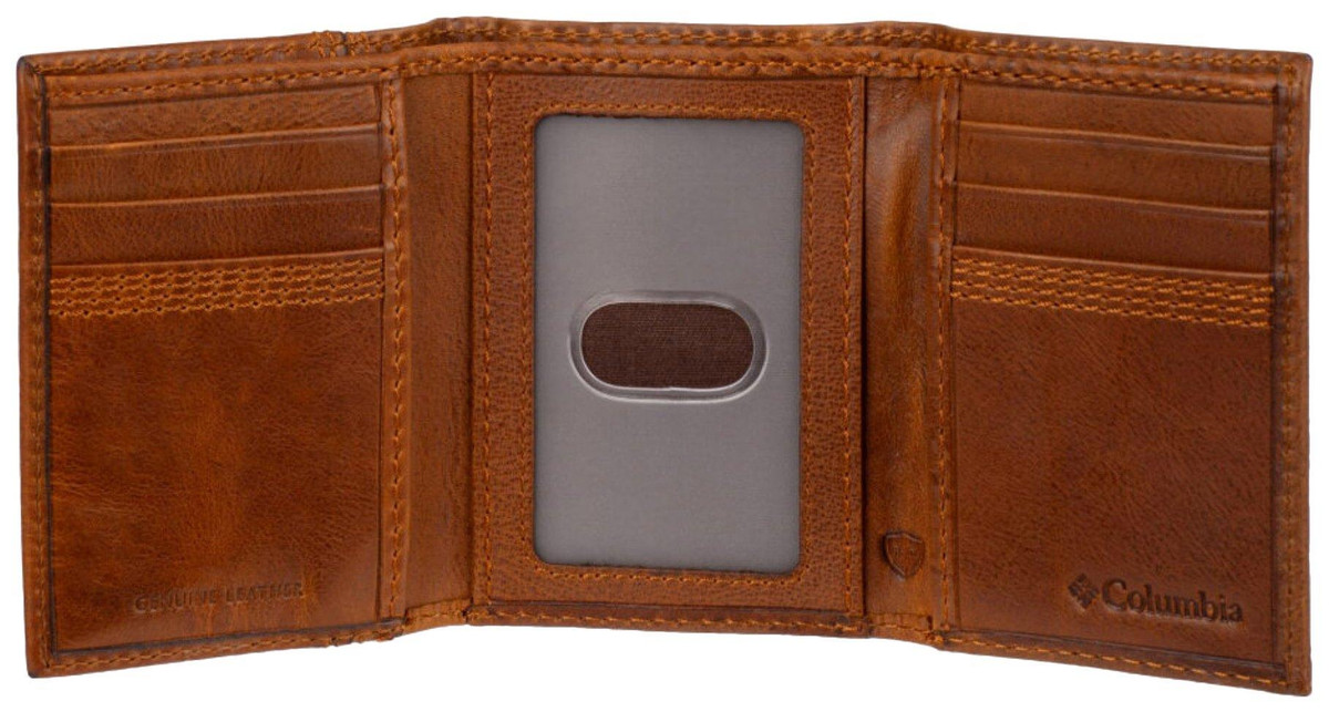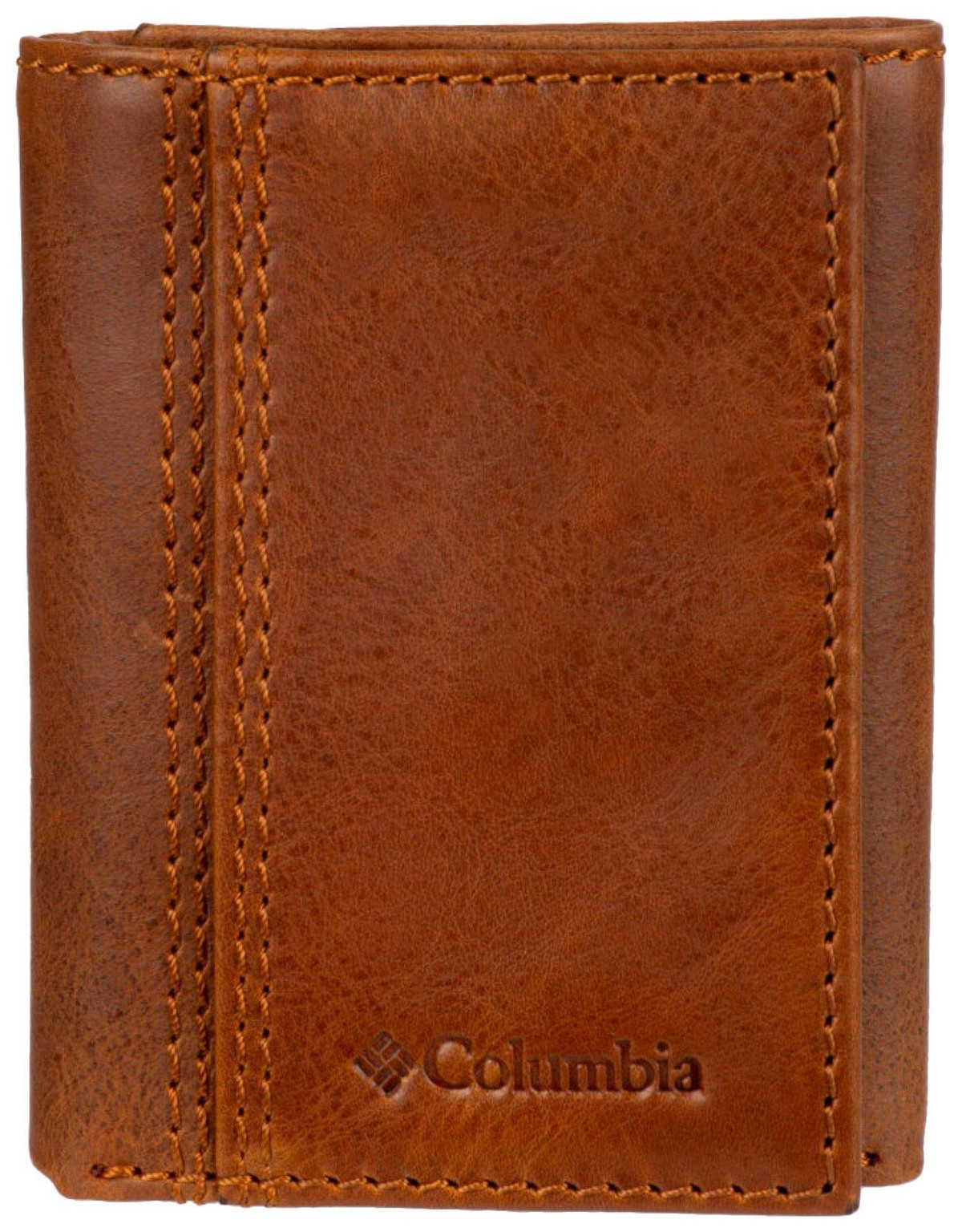 This Mens Trifold Wallet features a solid color design with heavy edge stitching on grainy leather, a trifold silhouette, a front embossed brand, an exterior slip pocket, slim profile, and RFID-blocking technology to help protect personal information from identity theft. Contains one ID window, 6 interior credit card slots, 2 slip pockets, and a currency compartment. Dimensions: 4.25 inches x 4.5 inches.
