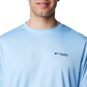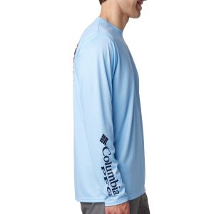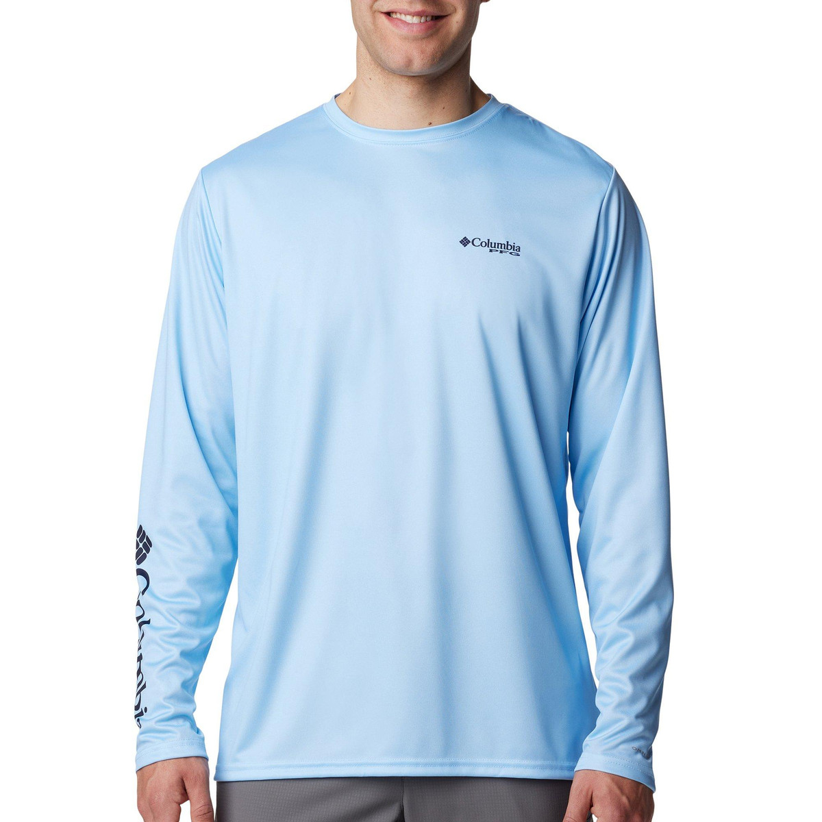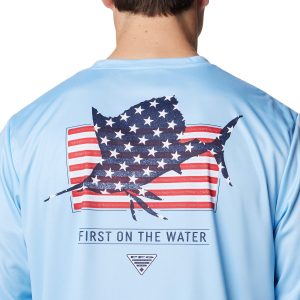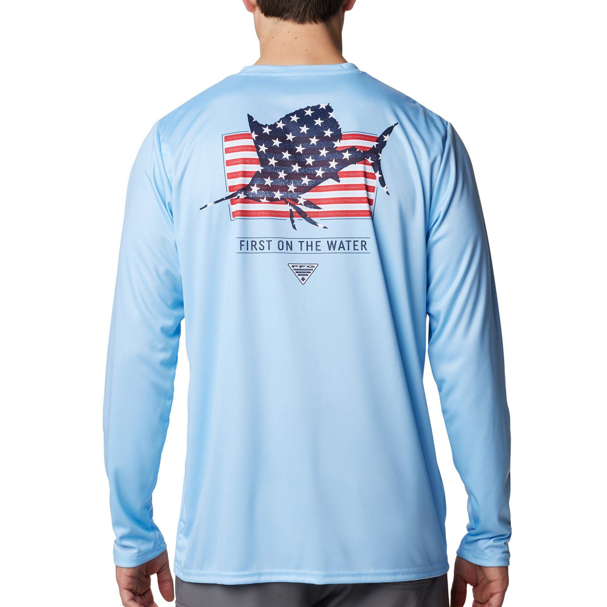 Keep each adventure going strong with this T-shirt by PFG Columbia. Stay safe & cool while out on the boat in this stylish long sleeve tee, featuring smooth interlock fabric, Omni-Shade UPF 50 sun protection, Omni-Wick moisture wicking technology to keep you dry, a comfortable crew neckline, Columbia logo on the chest and sleeve, and an USA fish flag screen print on the back.