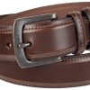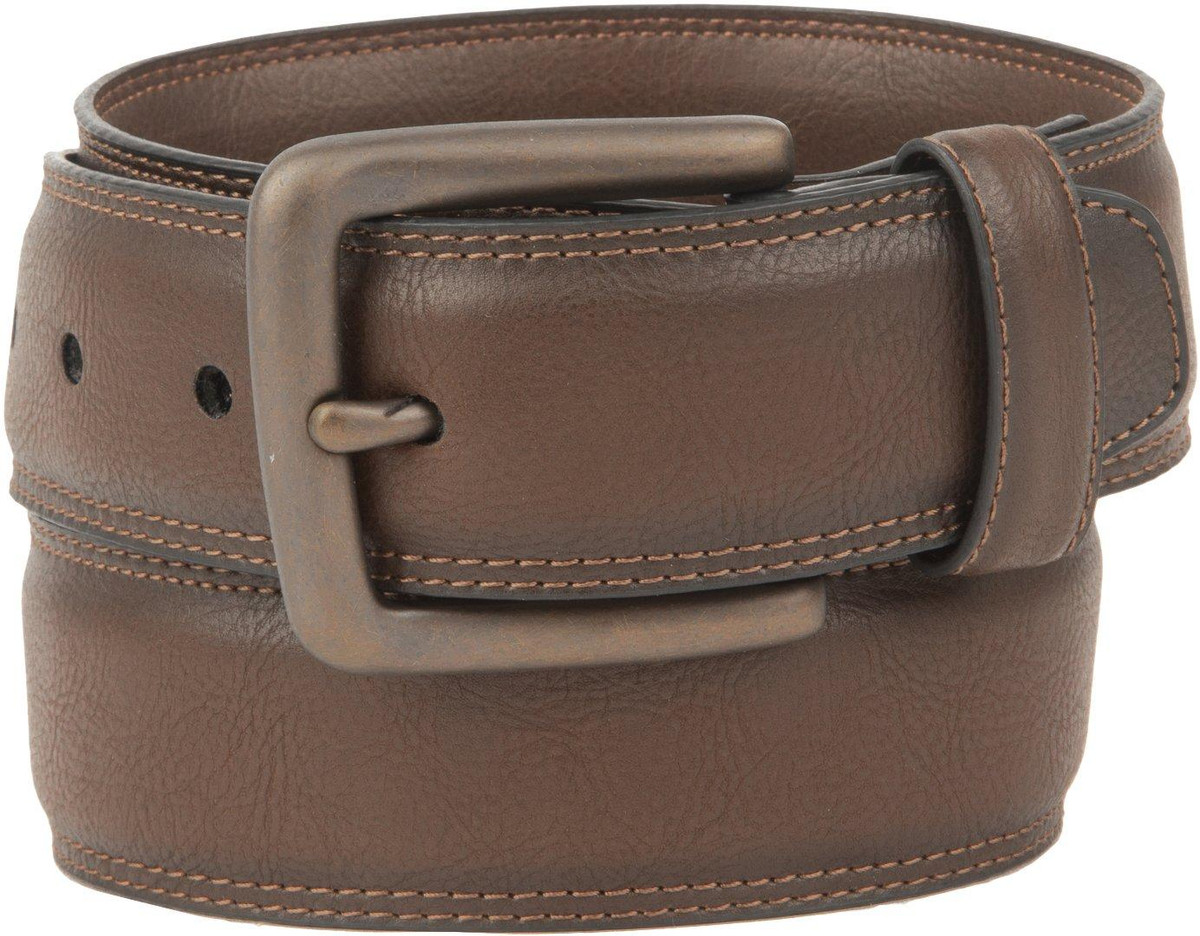 This belt features a solid color design on a vegan leather fabrication, flat edge with tonal dye and stitching detail, and a matching buckle. Measures approximately 40mm wide.