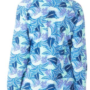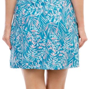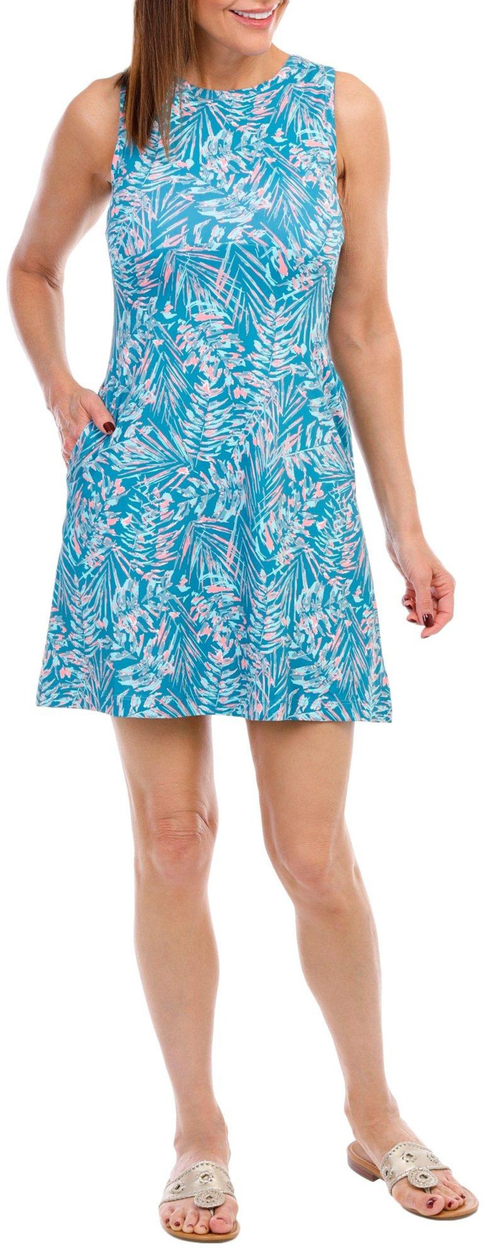 This sleeveless dress features a print design on lightweight stretch knit fabric, a scoop neckline, fixed shoulderstraps, Omni-Shade UPF 50 sun protection, Omni-Freeze cooling, and moisture-wicking technology. The top length measures approximately 35 in. Fabrication 92% polyester, 8% elastane jersey.