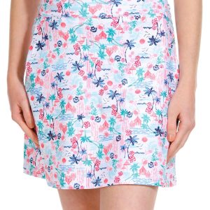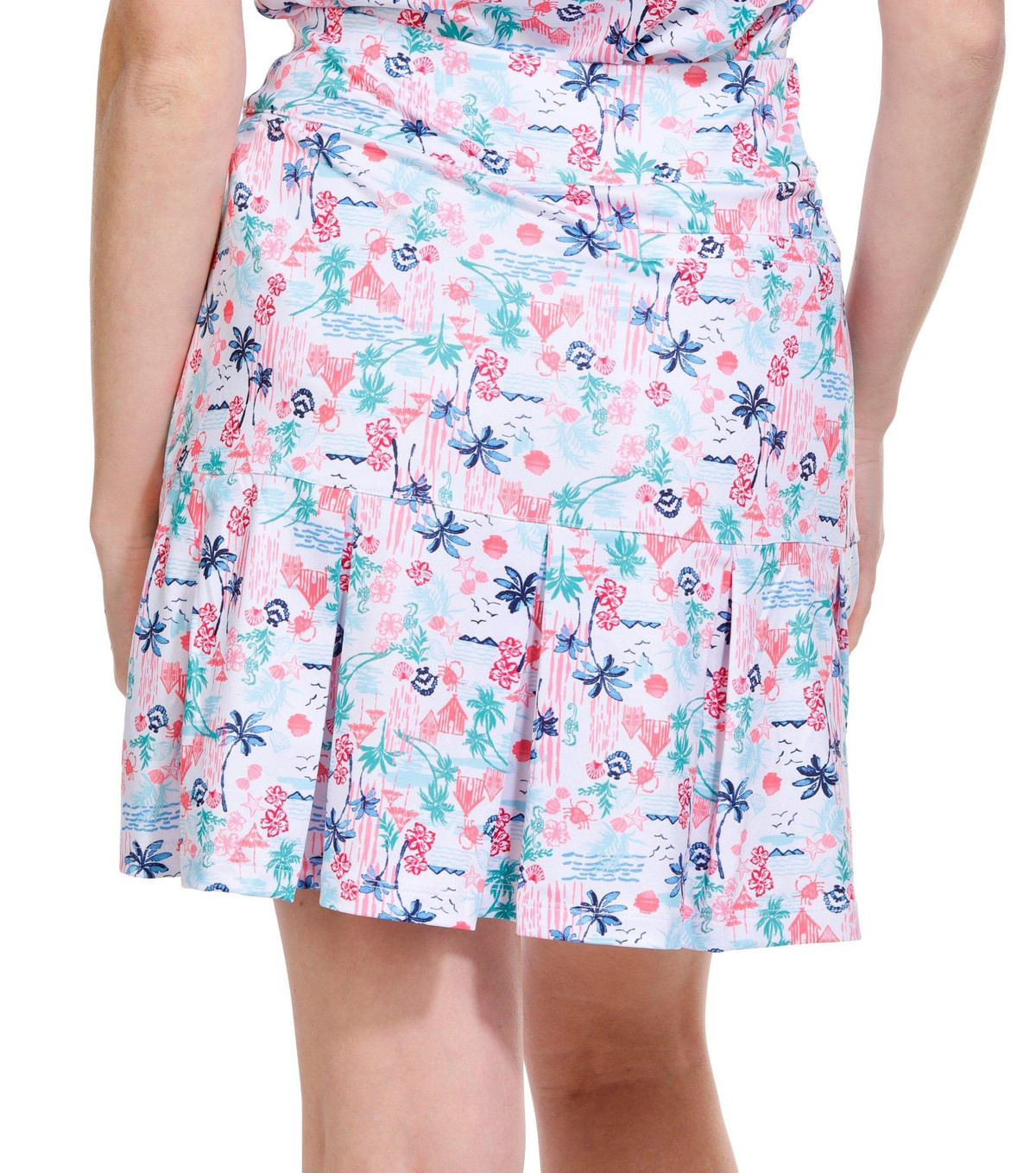This pull-on skort features a colorful print design on lightweight stretch knit fabric, an elastic waistband, two side seam pockets, one slip back pocket, back pleat details, and built-in shorts. Measures approximately 17 inches. Inseam measures approximately 3 inches. Fabrication 92% polyester, 8% spandex.