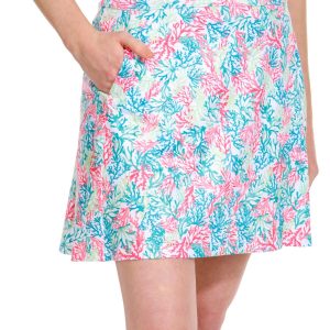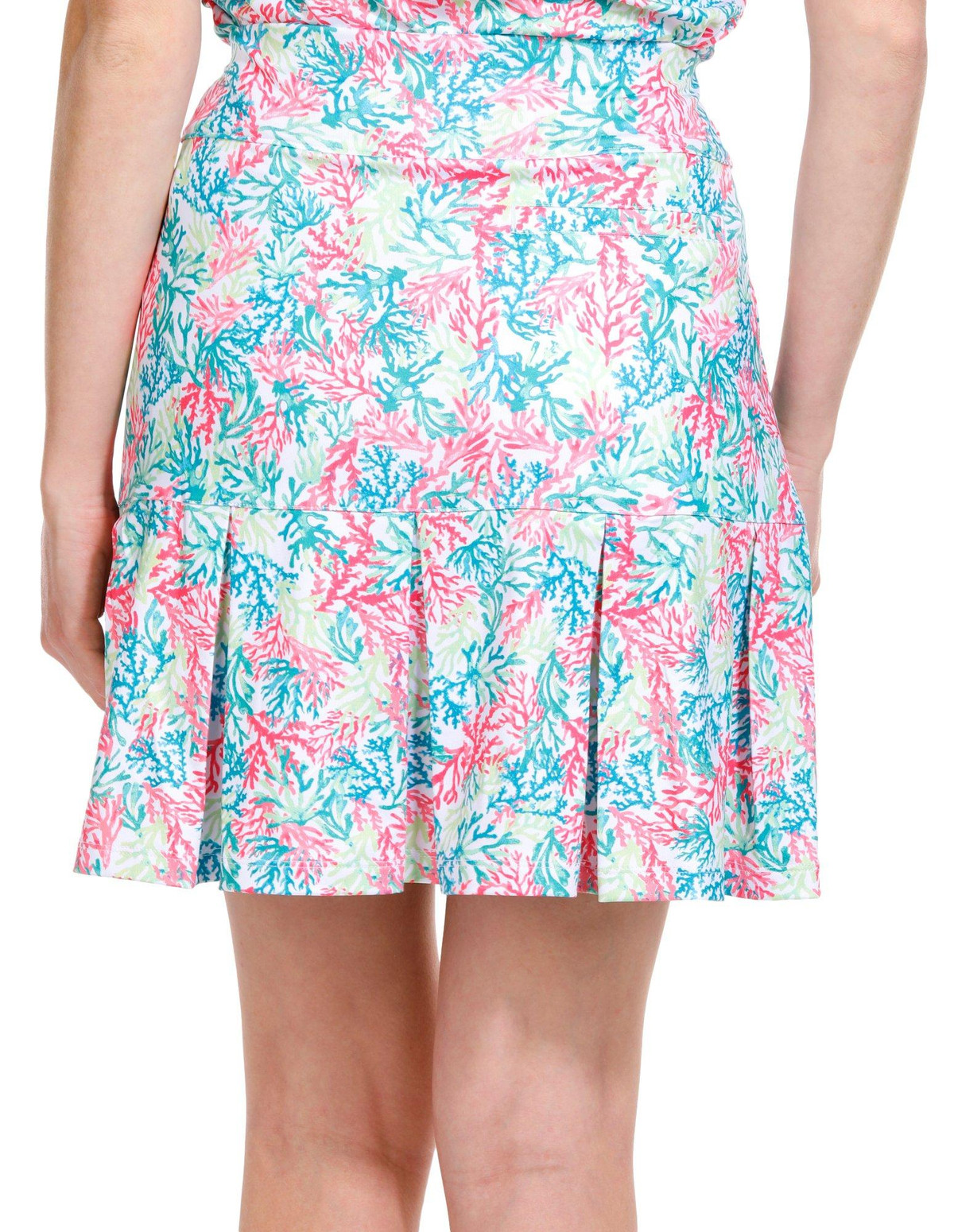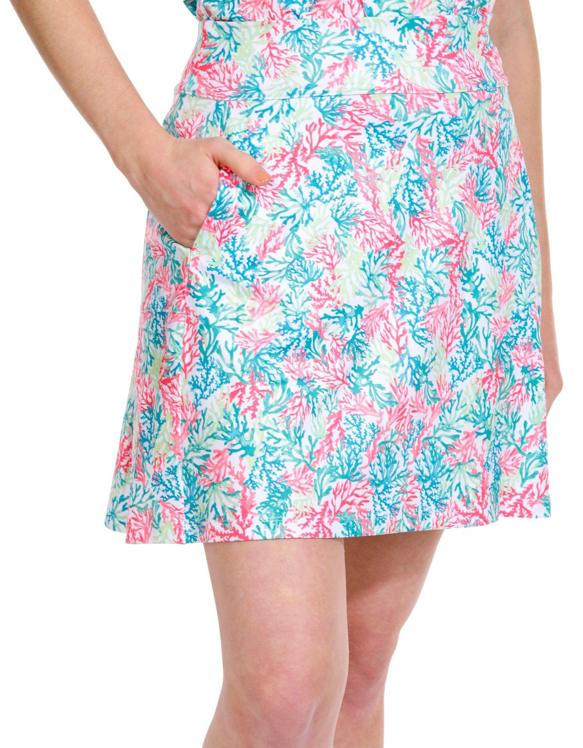 This pull-on skort features a colorful print design on lightweight stretch knit fabric, an elastic waistband, two side seam pockets, one slip back pocket, back pleat details, and built-in shorts. Measures approximately 17 inches. Inseam measures approximately 3 inches. Fabrication 92% polyester, 8% spandex.