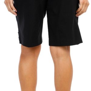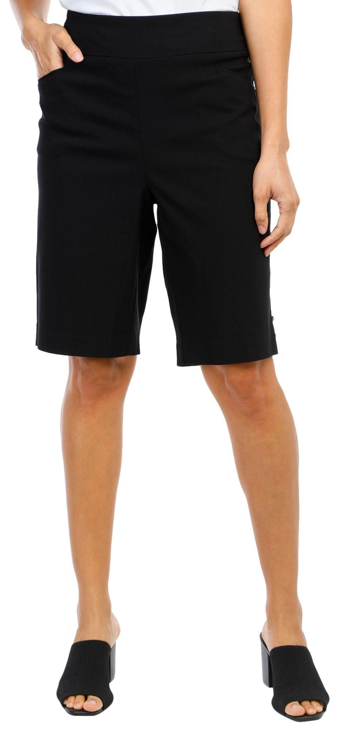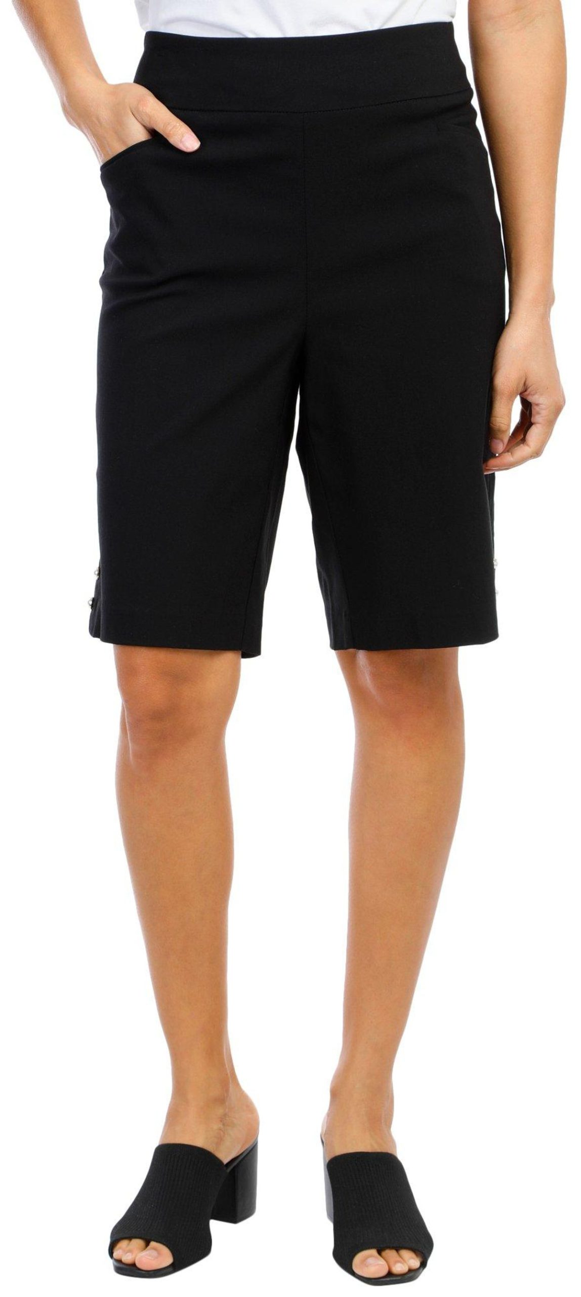 Step into effortless style with our Solid Color Pull-On Shorts. Featuring elegant pearl button hem details, these shorts add a touch of sophistication to your casual wardrobe. The hidden elastic waist ensures a perfect fit, while the comfort stretch fabric allows for all-day ease and flexibility. Whether youre running errands or enjoying a sunny day out, these shorts are your go-to for chic comfort. Inseam measures approximately 11 in. Fabrication is 75% rayon, 22% nylon, and 3% spandex.