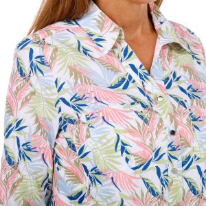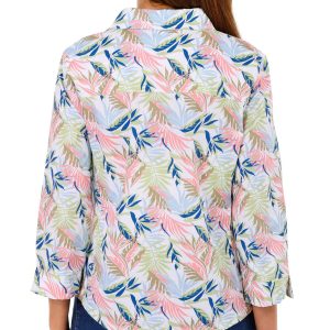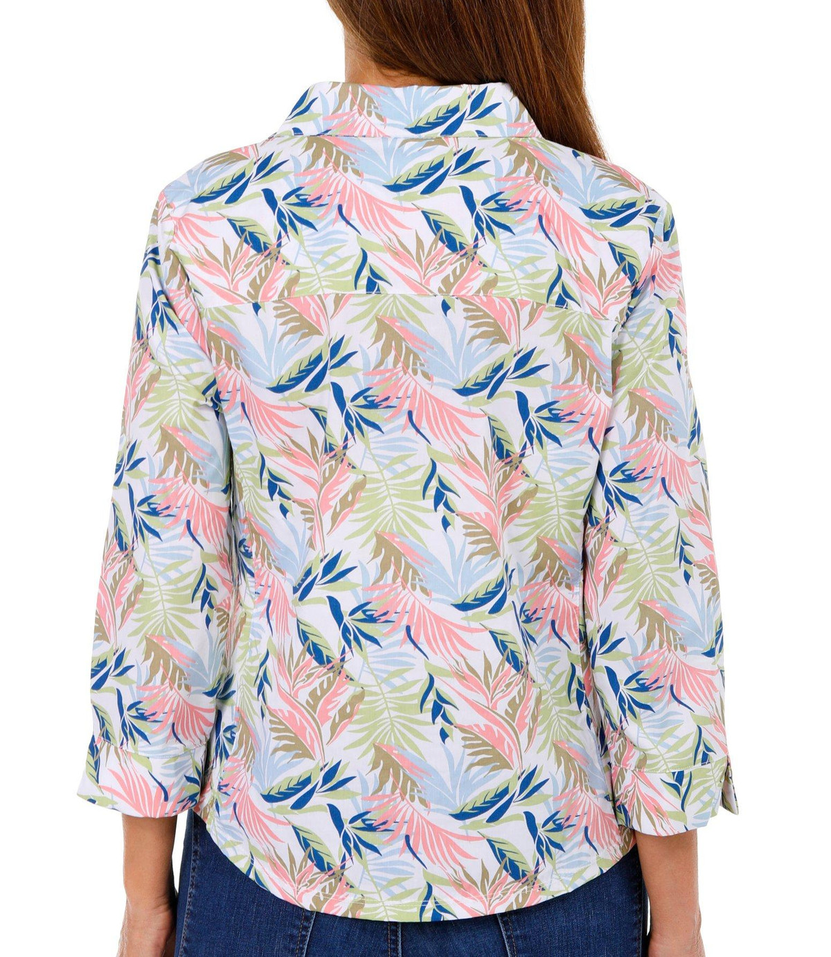 This Petite 3/4 Sleeve Button Down Top is a versatile addition to your wardrobe. Featuring a stylish botanical print, it offers a chic yet casual look that is perfect for layering or wearing on its own. The 3/4 sleeves provide a flattering fit, while the button-down design adds a touch of classic sophistication. Ideal for any occasion, this top offers both comfort and style. Fabrication is 67% cotton, 29% polyester, and 4% spandex
