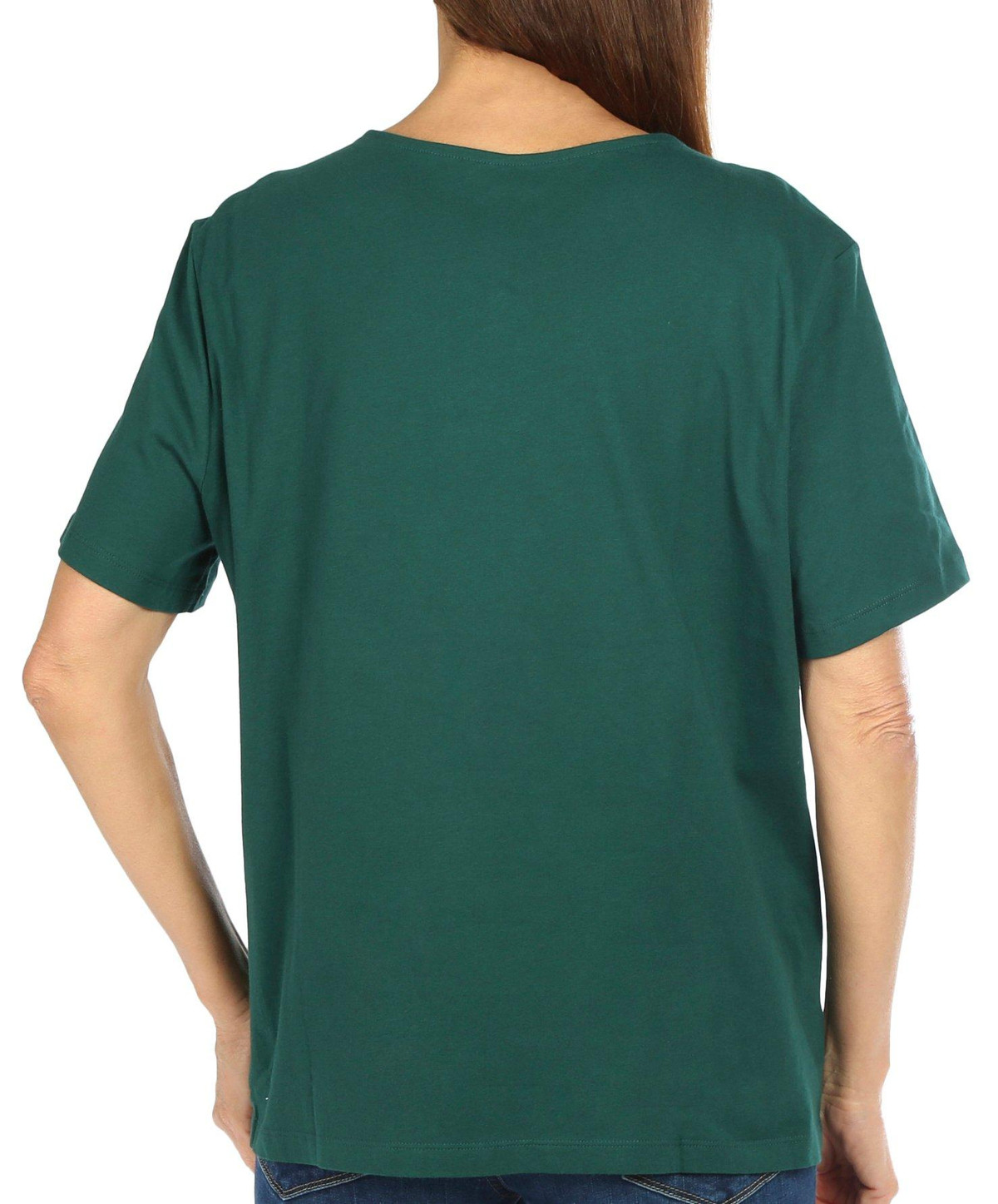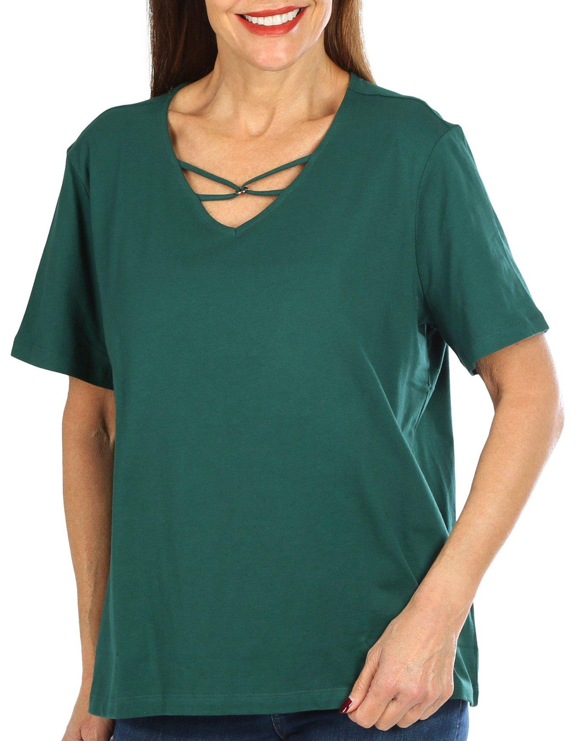 Coral Bay offers classic casual collections for your relaxed lifestyle. This short sleeve top features a solid color design on soft lightweight knit fabric, a v-neckline with criss cross ring detail, and classic styling. The top length measures approximately 25 in. Fabrication 100% cotton.
