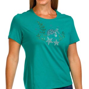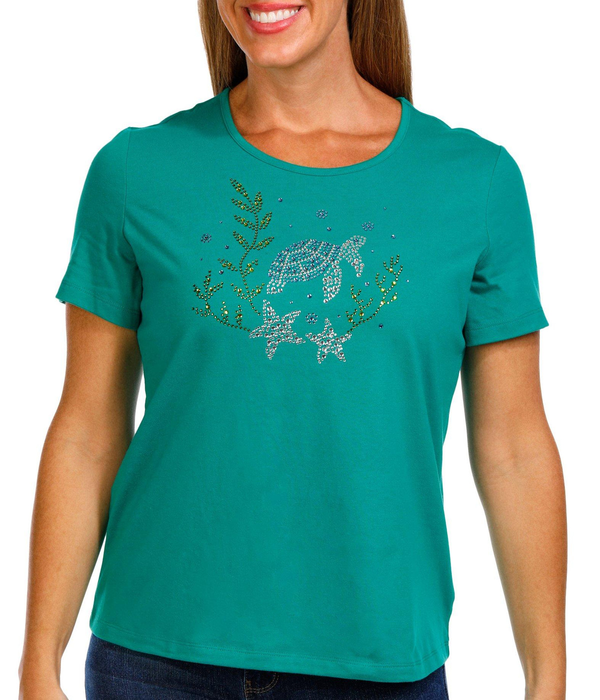 Add a playful sparkle to your look with this Petite Short Sleeve Rhinestone Sea Turtle Top. Featuring a scoop neckline and short sleeves, its adorned with a shimmering rhinestone sea turtle design that brings a touch of coastal charm to your casual wardrobe. Fabrication 60% cotton, 40% polyester