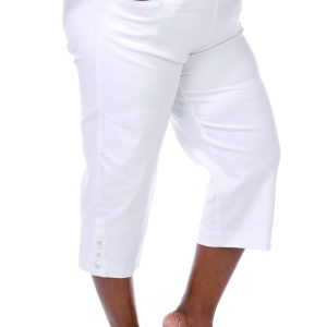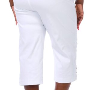 These plus size capris feature a solid color with a pull on waistband for easy wear. Front pockets add function while floral shaped grommets at the hem bring a stylish touch. The 21 inch inseam offers a flattering cropped fit. Fabrication 75% nylon, 22% nylon, 3% spandex
