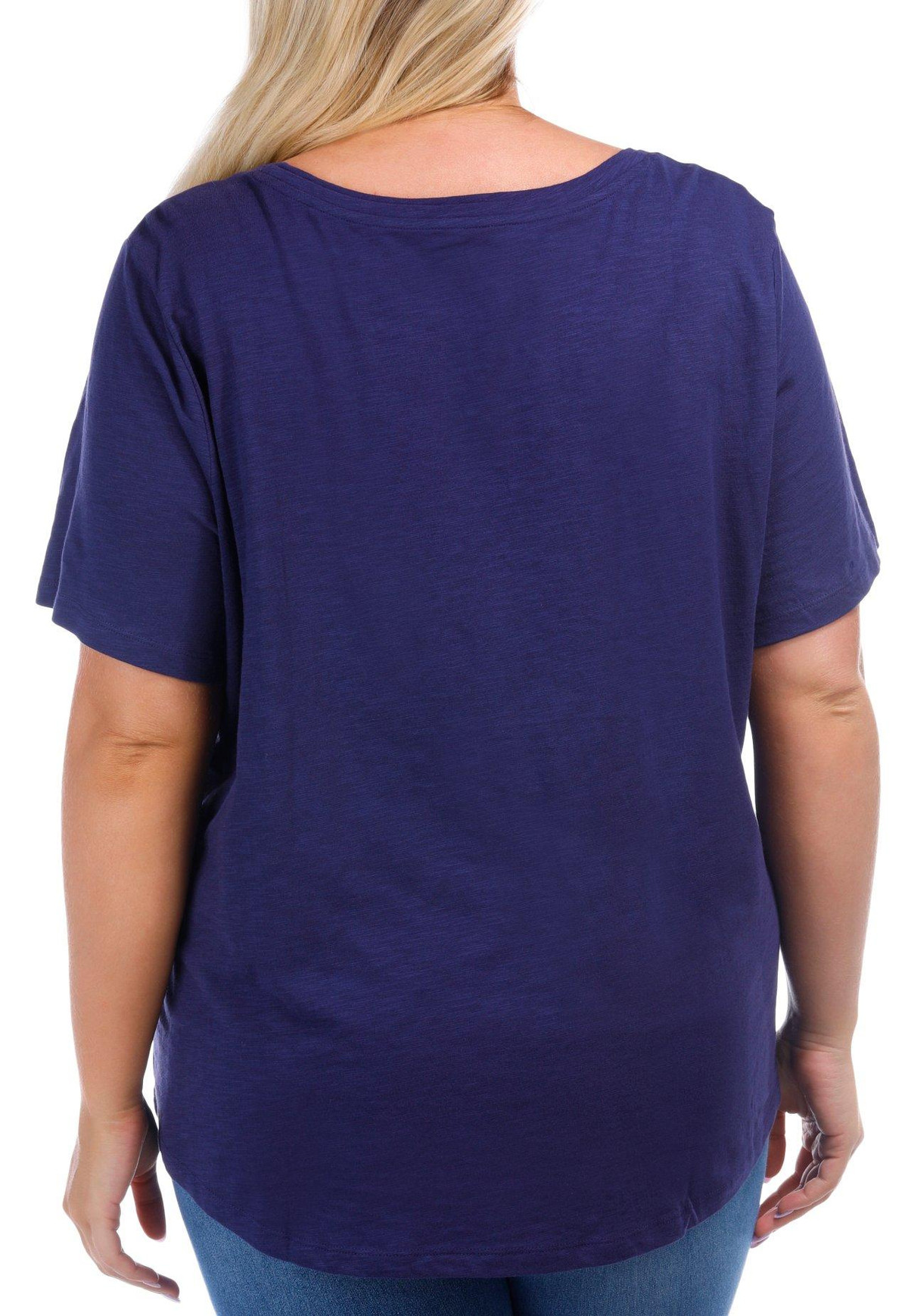 Show your patriotic flair with this Plus Embellished At The Beach Short Sleeve T-Shirt. Crafted from a soft cotton, it features a fireworks at the beach design adorned with sparkling rhinestones. The short sleeves and flattering double scoop neckline add comfort and style, perfect for festive summer days. Fabrication is 100% Cotton. Top length measures approximately 29 in.