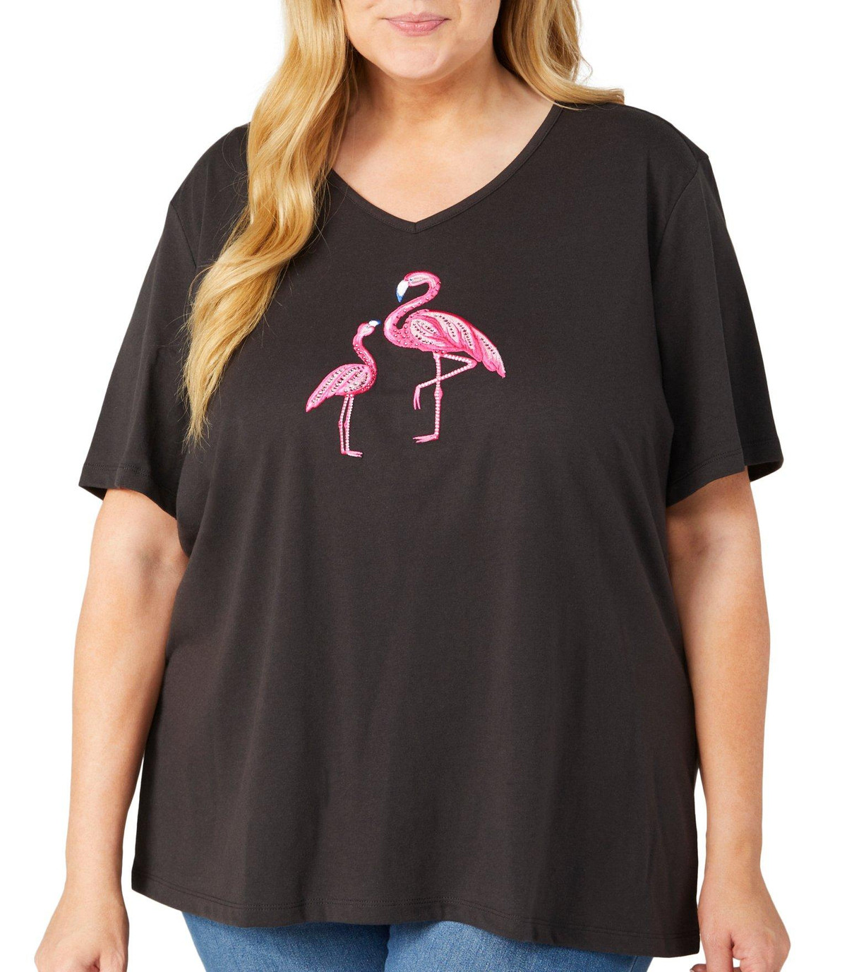 Add a splash of charm to your wardrobe with the Plus Embellished Flamingo Short Sleeve Top. Crafted from a soft and durable blend of 60% cotton and 40% polyester, this top offers all-day comfort with a lightweight feel. The short sleeves provide a relaxed fit, while the delightful embellished flamingo design brings a whimsical, tropical vibe to your look.