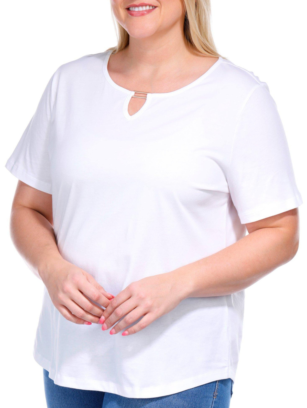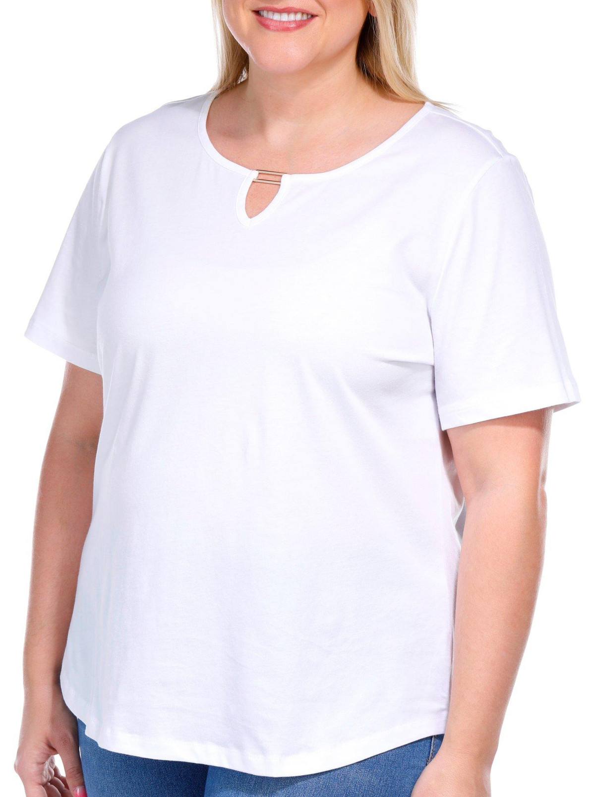 The Short Sleeve Everyday Tee is crafted from soft cotton, offering ultimate comfort for daily wear. Featuring a stylish keyhole neckline with a rectangle bar detail, this tee adds a subtle yet chic touch to your casual wardrobe. The breathable fabric ensures you stay cool and comfortable throughout the day. Top length measures approximately 26 in.