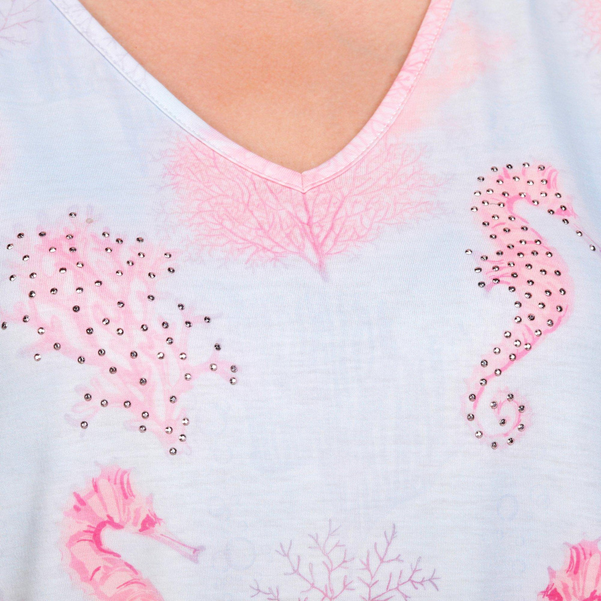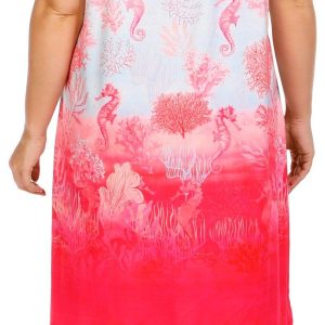 This plus size swing dress features short sleeves, a v-neckline, and a seahorse and coral graphic with rhinestone accents. Made from soft fabric, it offers a relaxed fit perfect for lounging, sleepwear, or casual activities. Fabrication 95% polyester, 5% spandex