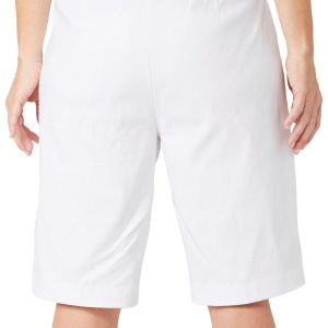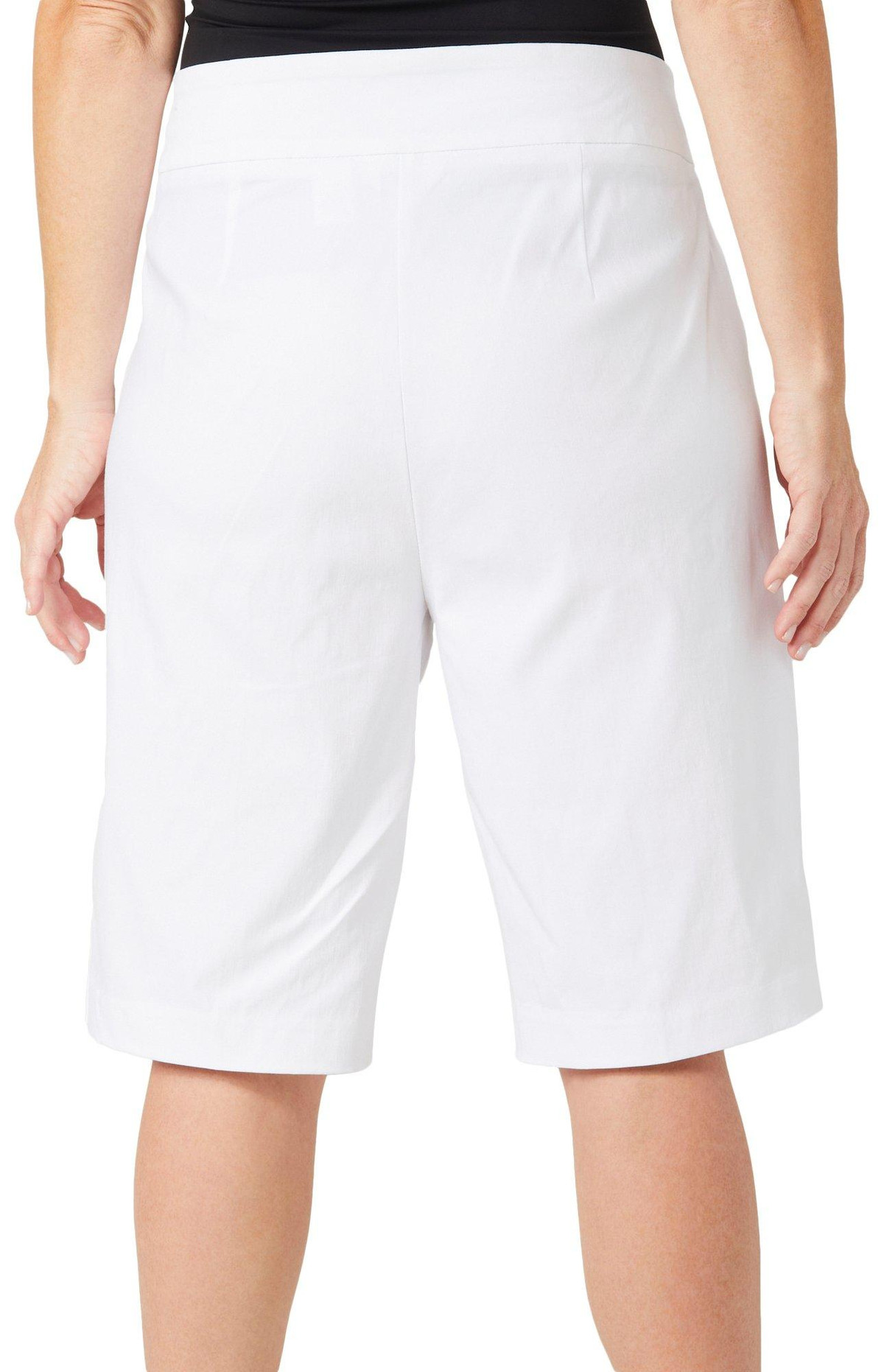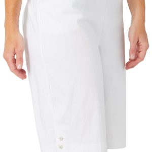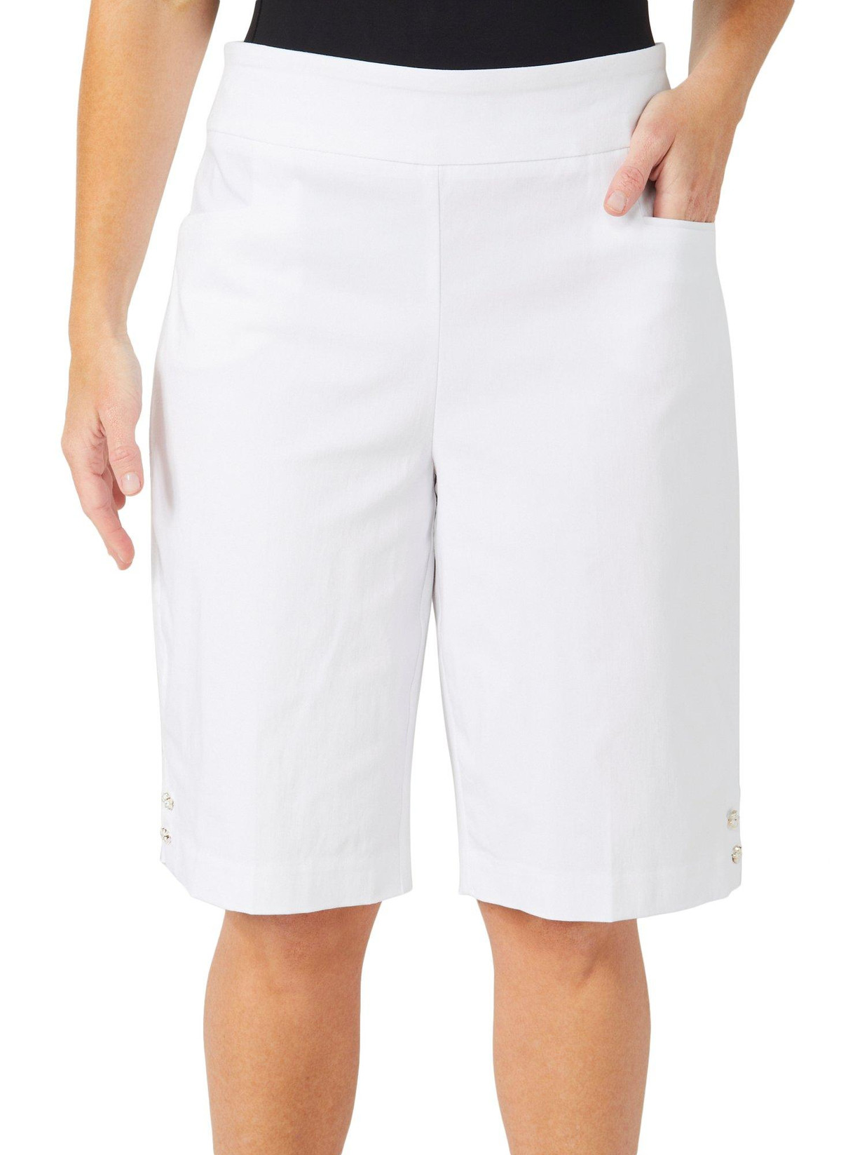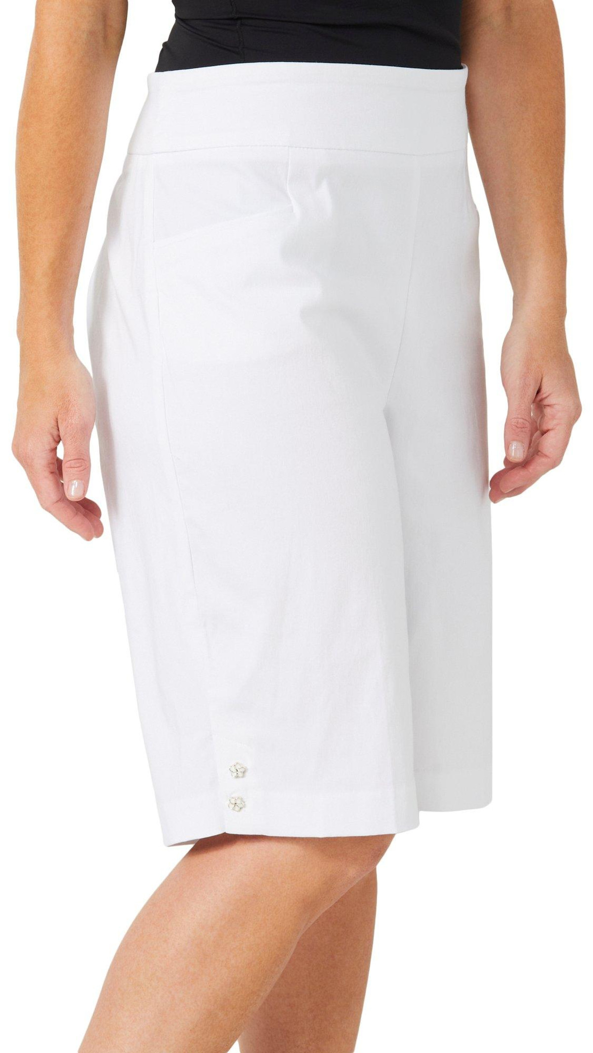 Freshen up your look with these solid color Bermuda shorts, featuring charming flower button accents at the hem and double front pockets for everyday ease. The tailored fit and playful details strike the perfect balance between polished and fun. Inseam measures approximately 12 in. Fabrication is 75% rayon, 22% nylon, and 3% spandex.