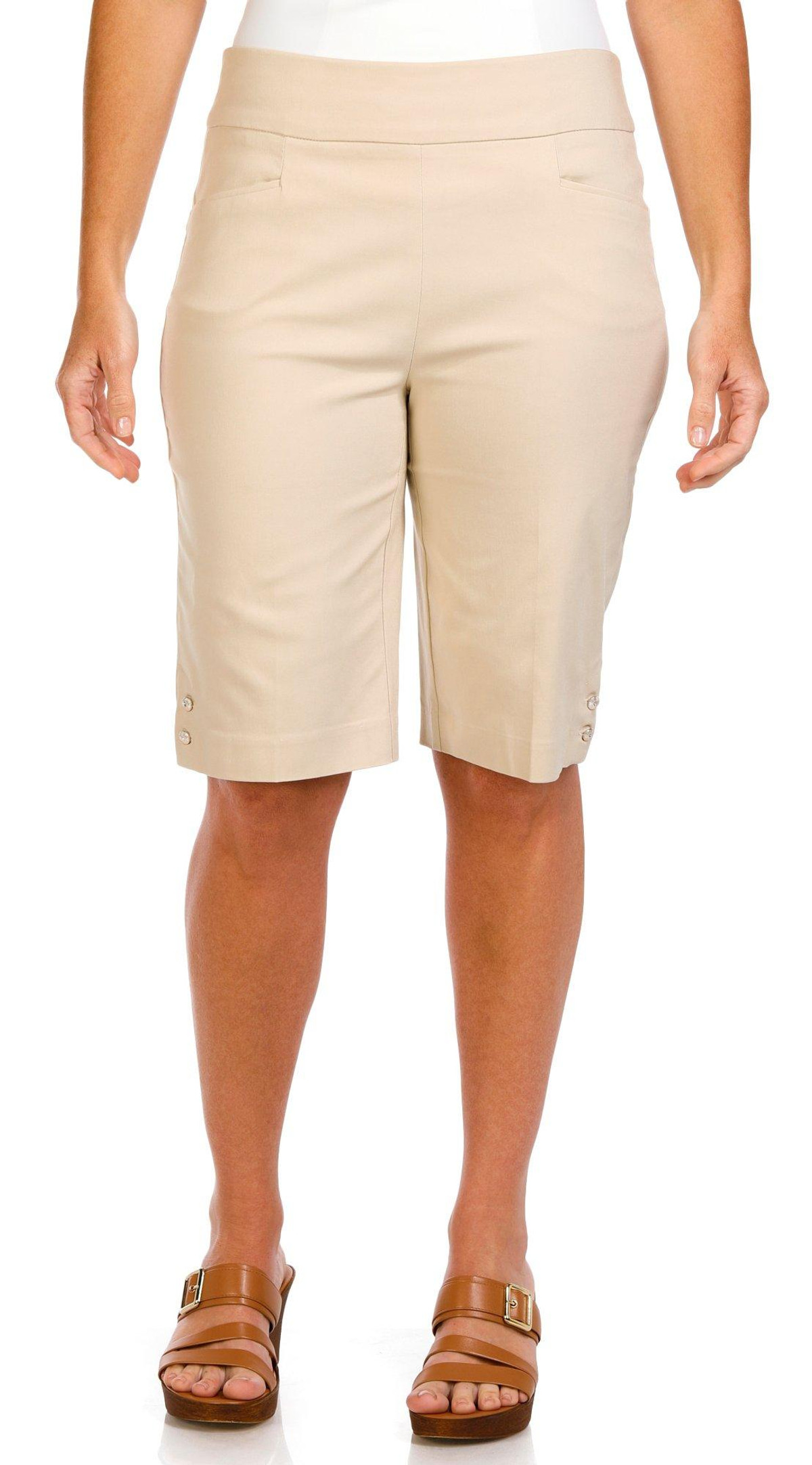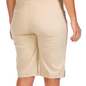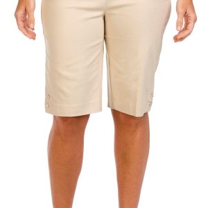Step into style with the Women’s 12 in Gold Button Accent Bermuda Shorts. Featuring a comfortable pull-on waistband, front pockets, and a sleek 12-inch inseam, these shorts are finished with chic gold button accents at the hem for a polished touch.