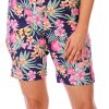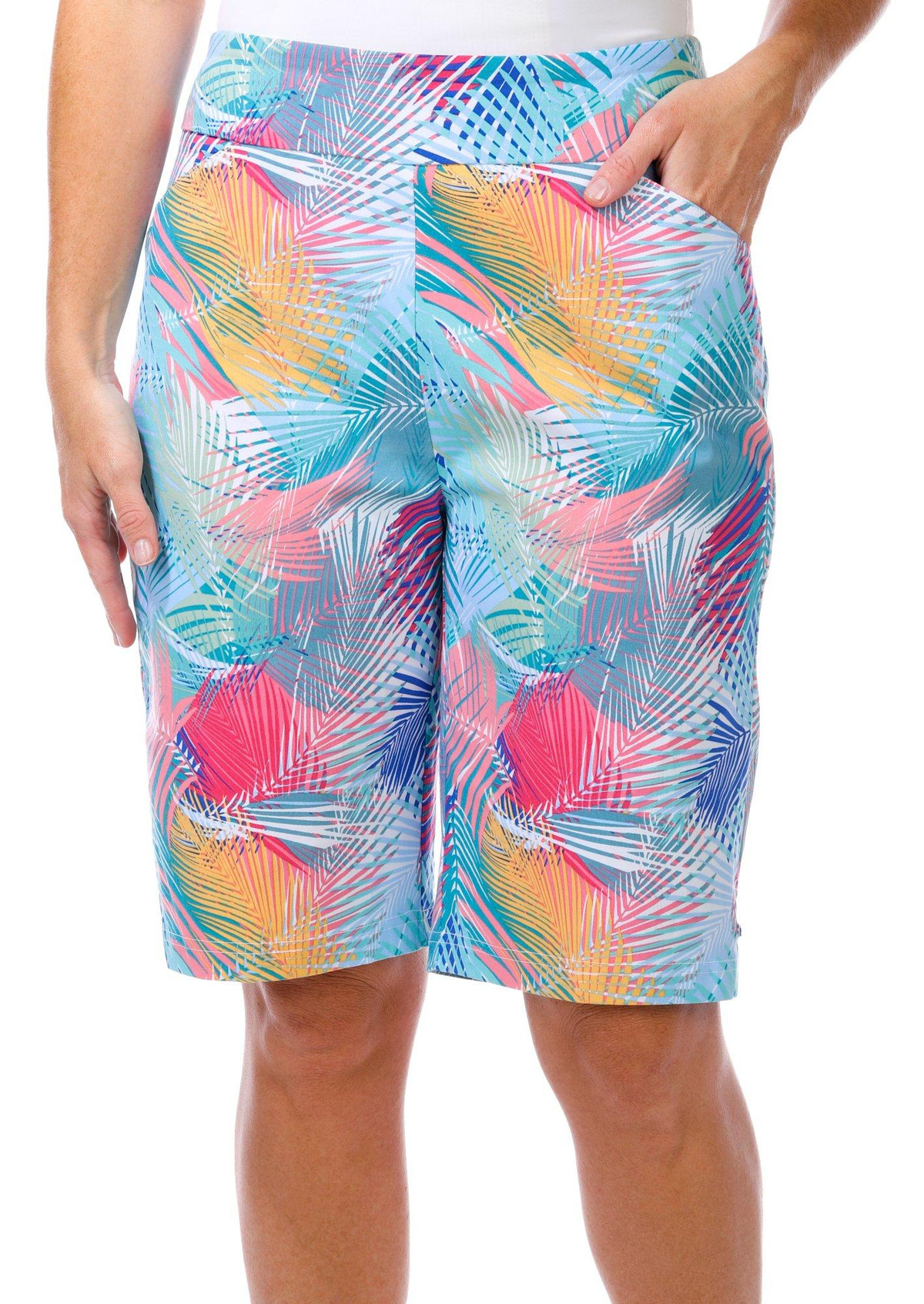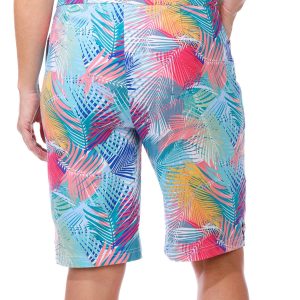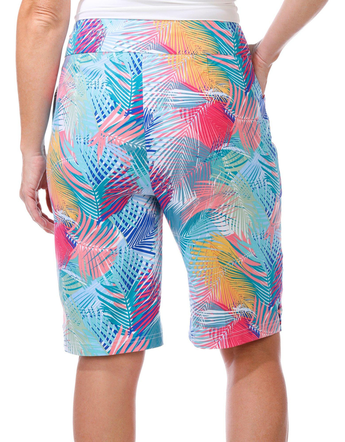 Breeze through warm days in the Women’s Green Breeze Grommet Bermuda Shorts. Featuring a tropical palm leaf print, pull-on waistband, and stylish grommet accents at the hem, these shorts offer both flair and function. Front pockets and a 12-inch inseam provide comfort and coverage for active wear. Fabrication 77% rayon, 20% nylon, 3% spandex.