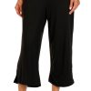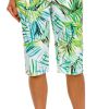 These pull-on capris feature a solid design on lightweight comfort stretch fabric, a hidden elastic waistband for optimal comfort, a slimming tummy panel, front pockets, two faux back pockets, and side split hemlines. Inseam measures approximately 21 inches. Fabrication 75% rayon, 22% nylon, 3% spandex.