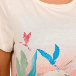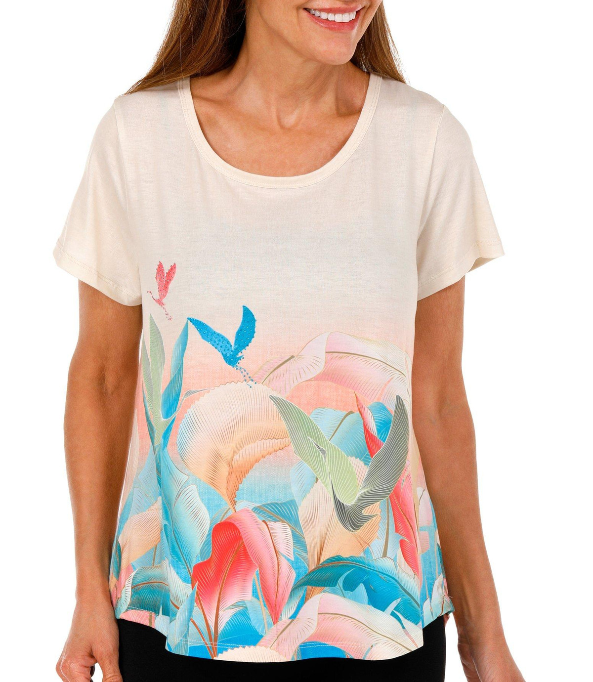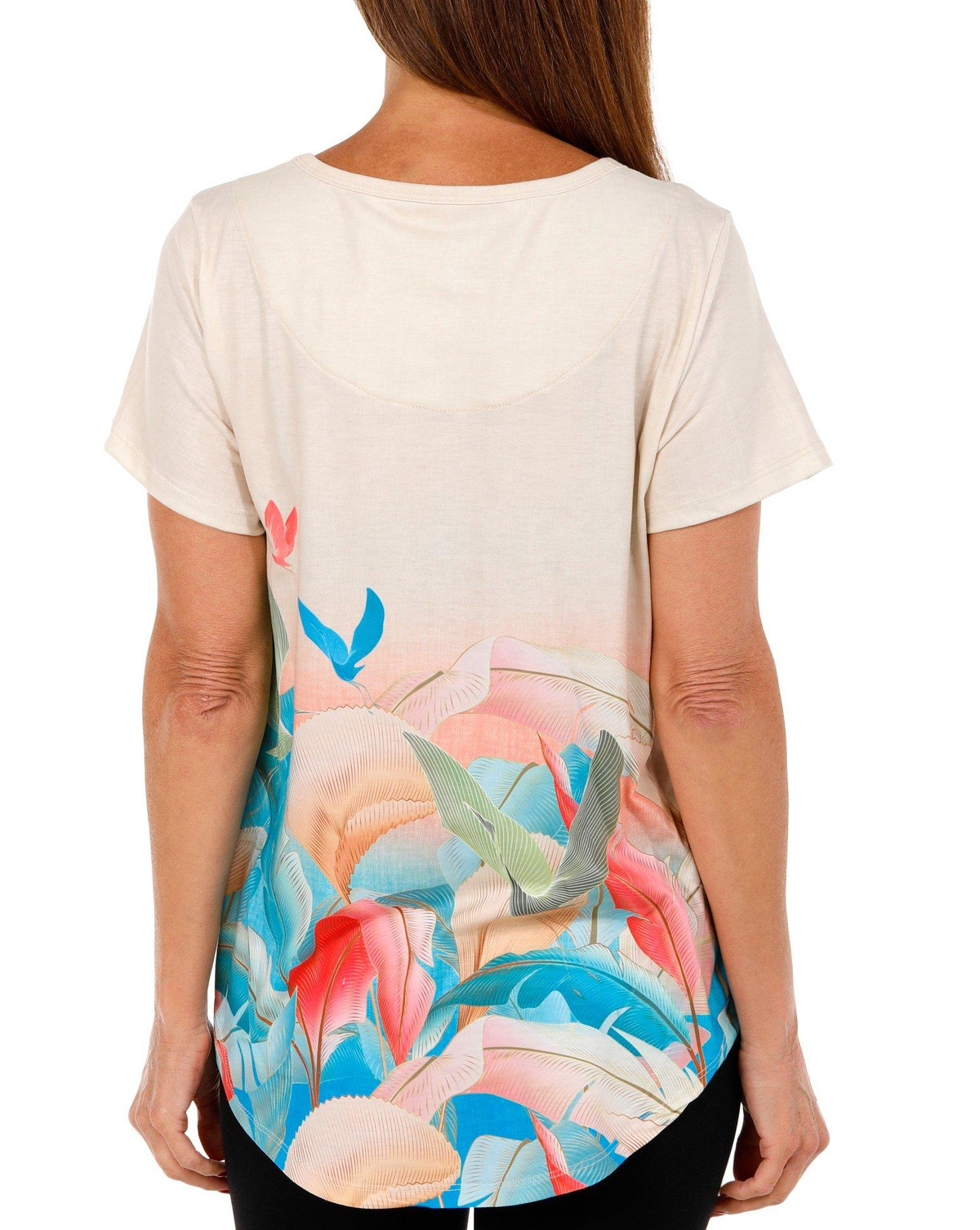 This women’s tee showcases a vibrant bird print on soft fabric with a classic crew neckline and short sleeves. The high to low hem adds a modern twist making it a playful yet comfortable choice for everyday wear. Fabrication 95% polyester, 5% spandex