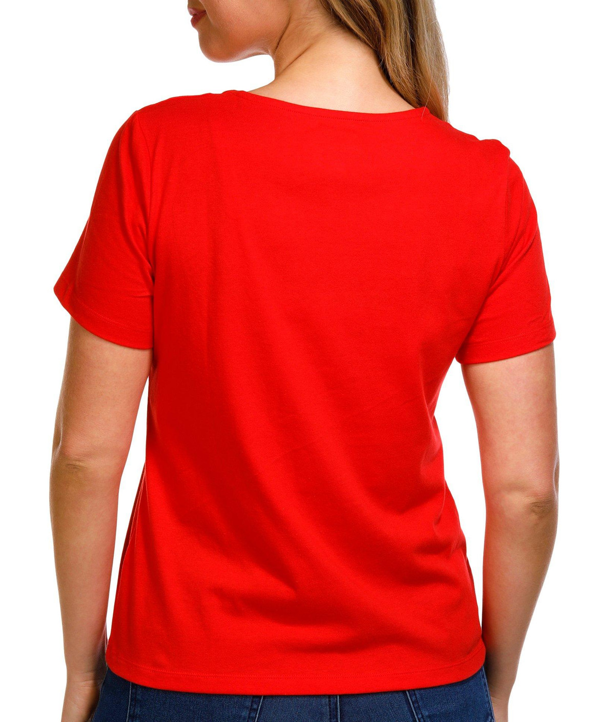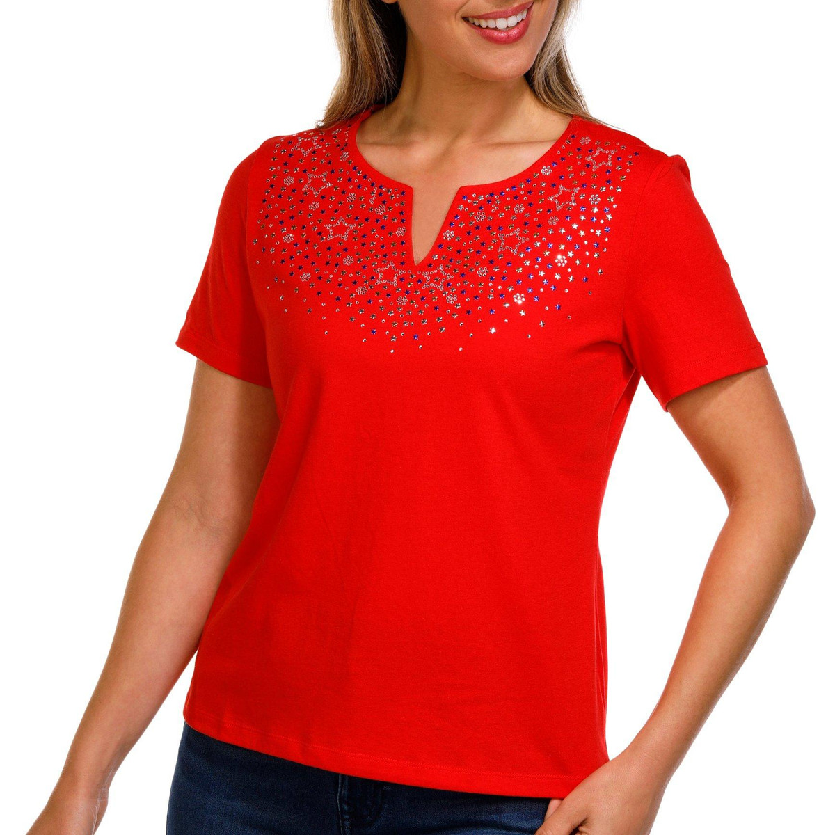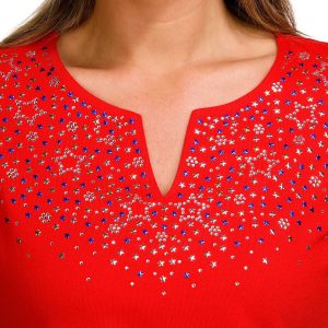 Show off your patriotic flair with this Women’s Split Neck Americana Star Top. Crafted from a soft cotton-poly blend, it features a sparkling rhinestone star design, a stylish split neckline, and short sleeves.