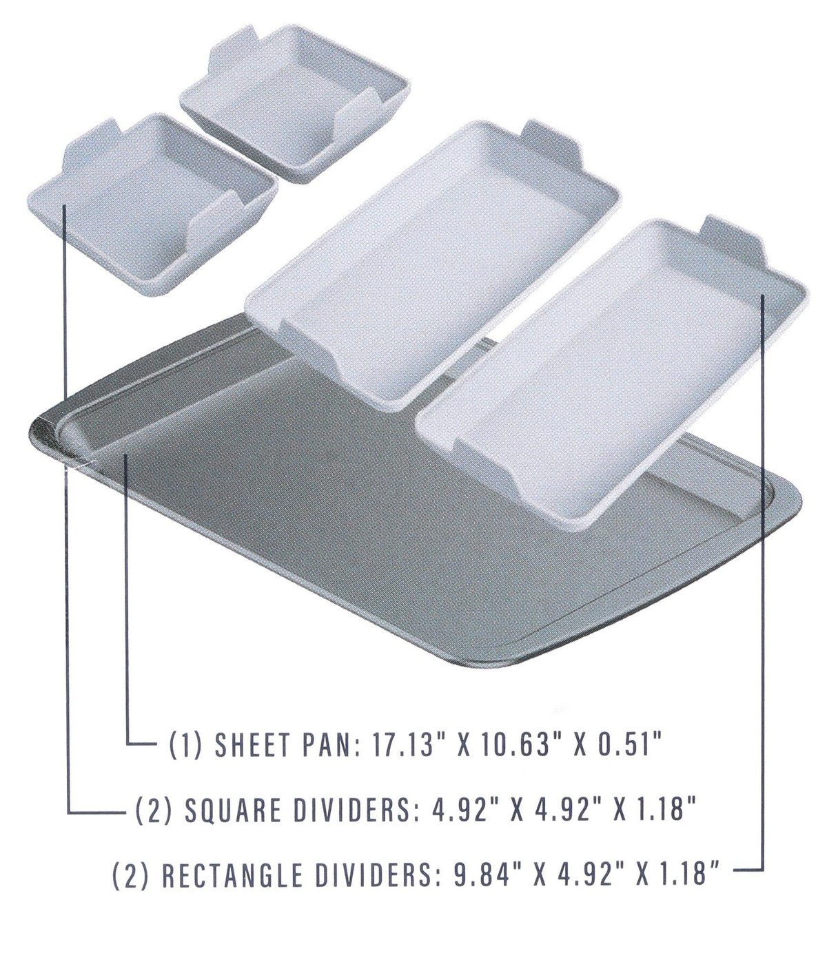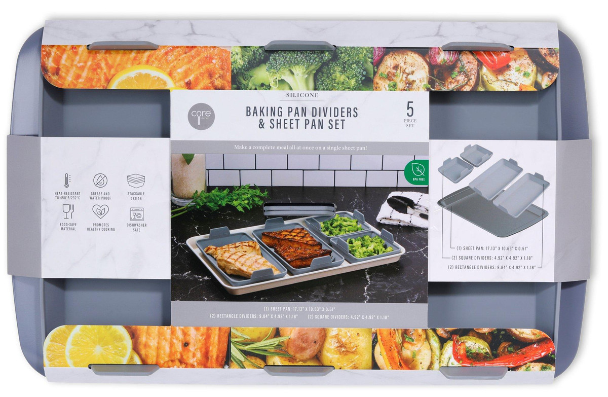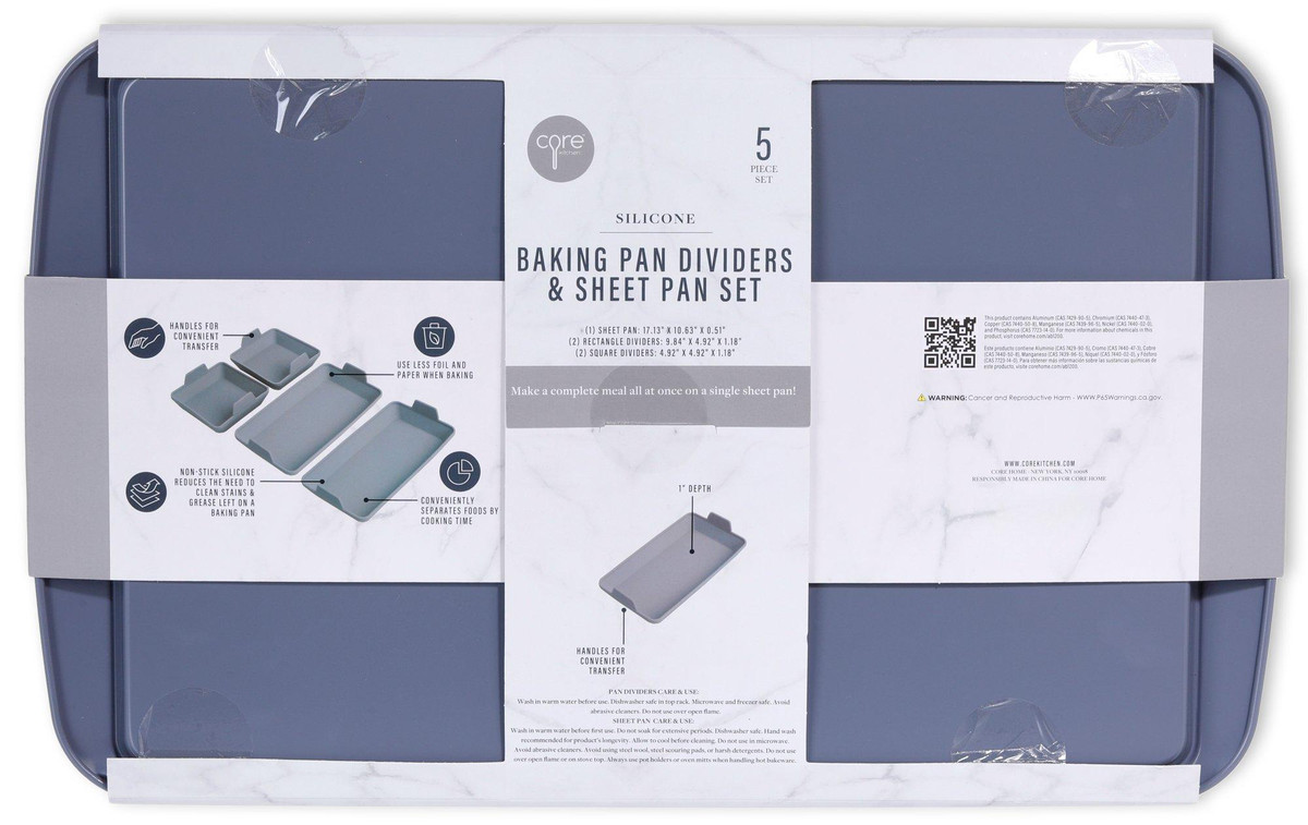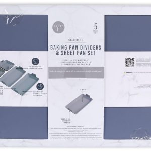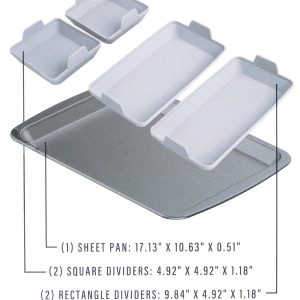 This Grey Baking Silicone Dividers & Sheet Pan Set includes 5 silicone dividers and 1 baking sheet pan. The silicone dividers help create even portions for your baked goods, while the baking sheet pan ensures even baking. An essential set for any baking expert looking for precision and consistency.