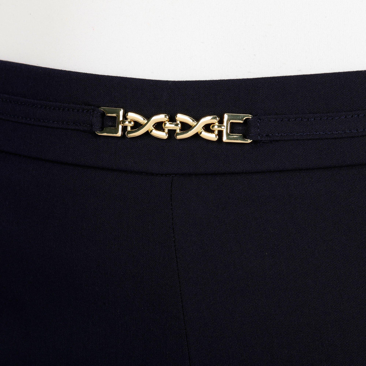 These stylish capris are ideal for your next trip out on the town, the office, and anywhere else! They feature a solid color design, flat front, and two front pockets with chain waist accents. Inseam is approximately 21 inches. Fabrication is 75% rayon, 22% nylon, and 3% spandex.