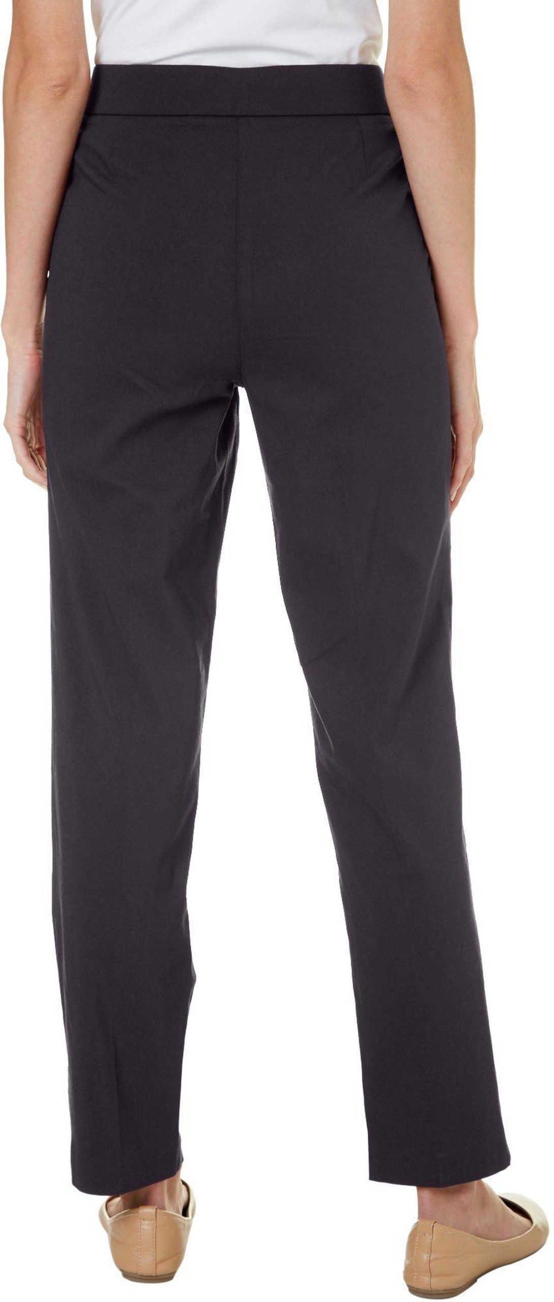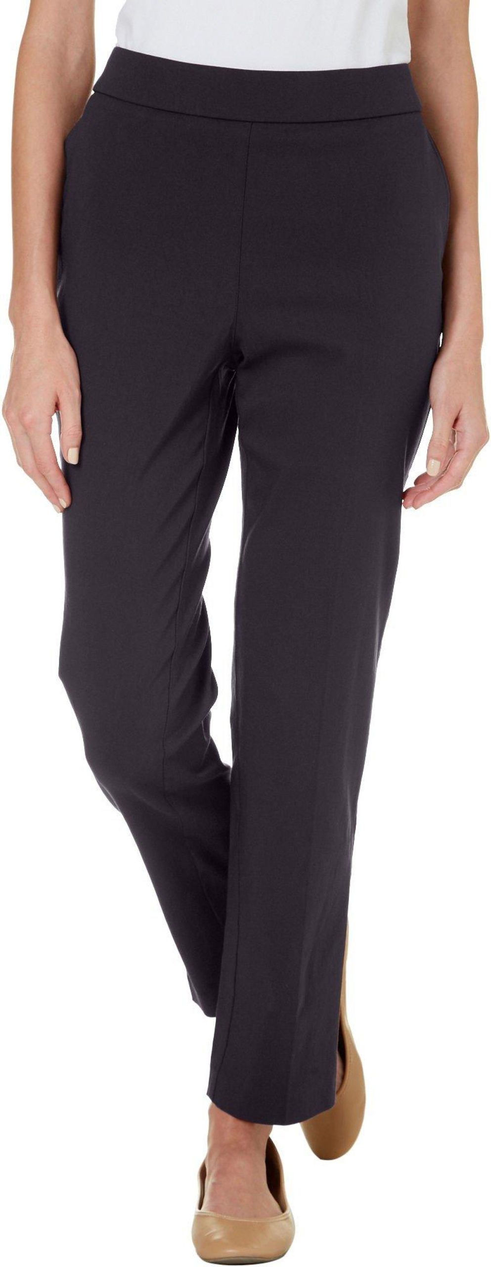 Counterparts offers a stylish look and a comfortable fit. These pants feature a solid color design on lightweight stretch fabric, an elastic waistband, a slimming tummy control panel, two front pockets, and pull-on styling. The inseam measures approximately 30 in. Fabrication 75% rayon, 22% nylon, 3% spandex.