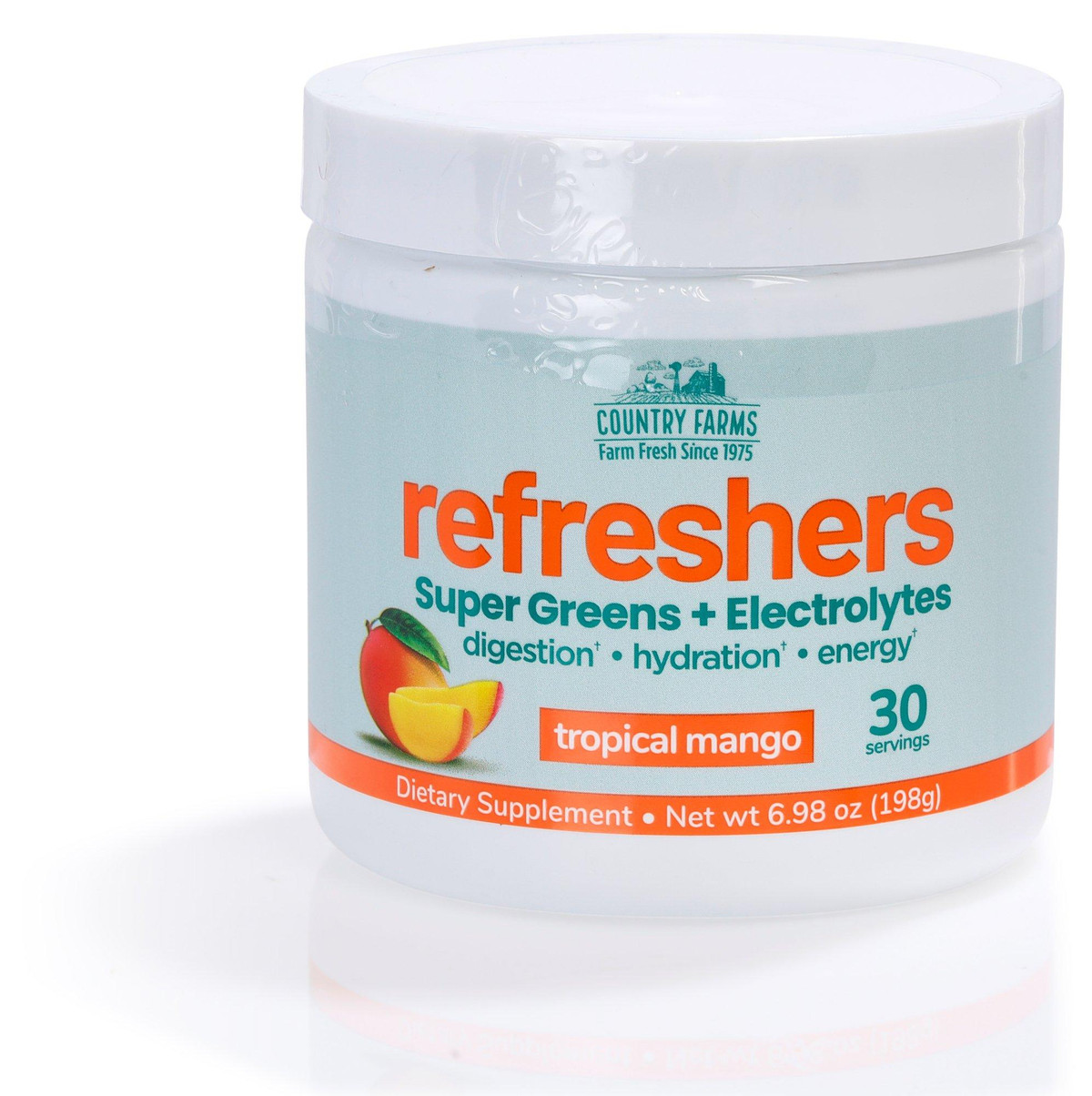 Revitalize your body with Refreshers Tropical Mango Supplement. Packed with super greens and electrolytes, this delicious supplement supports digestion, hydration, and energy levels. The tropical mango flavor makes it a refreshing treat, while the nutrient-rich formula helps you stay balanced and energized throughout the day. 30 servings. 6.98 OZ.