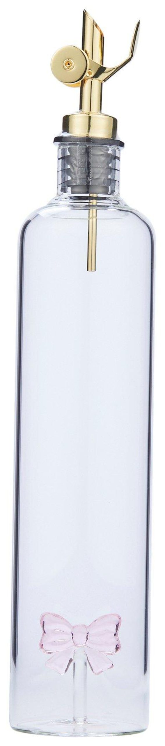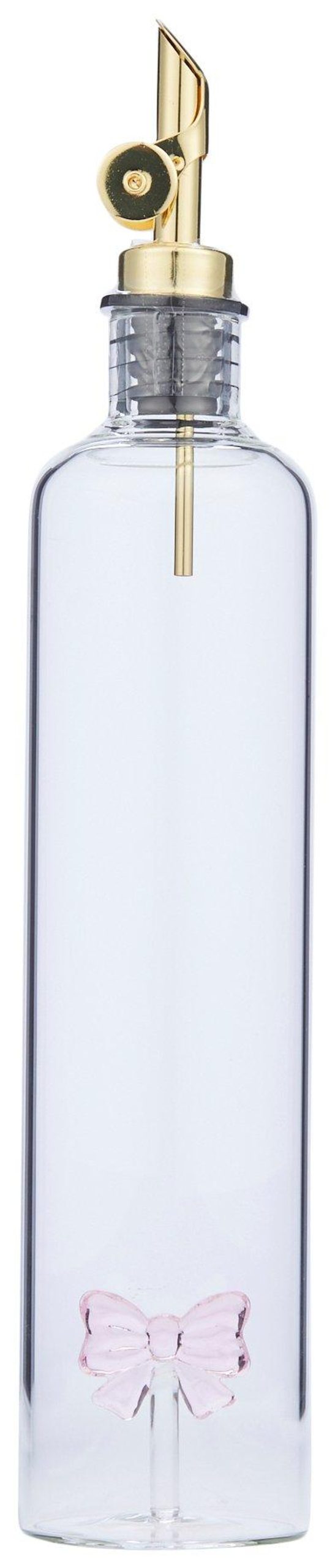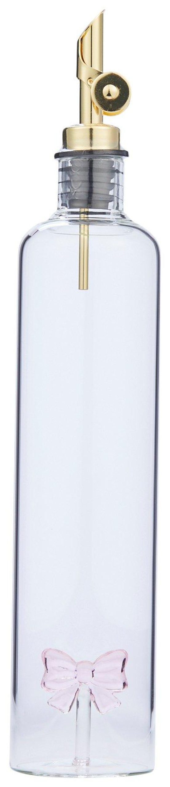 Enjoy an easy and hassle free pouring experience with the 17 oz Glass Oil & Vinegar Bottle! Featuring a gold spout and inner glass bow detail, this chic kitchen gadget is built to ventilate easy pouring over salads, pastas, sandwiches, and more. BPA Free.