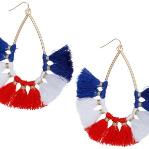 Celebrate bold style with these fanned earrings featuring a vibrant red, white and blue color palette. The dynamic design fans outward in a playful arrangement that adds movement and flair. With a graceful dangle, these statement earrings bring a festive and confident accent to your look.What materials are used in these earrings? What inspired the design of these earrings?How can I style these earrings for different occasions?