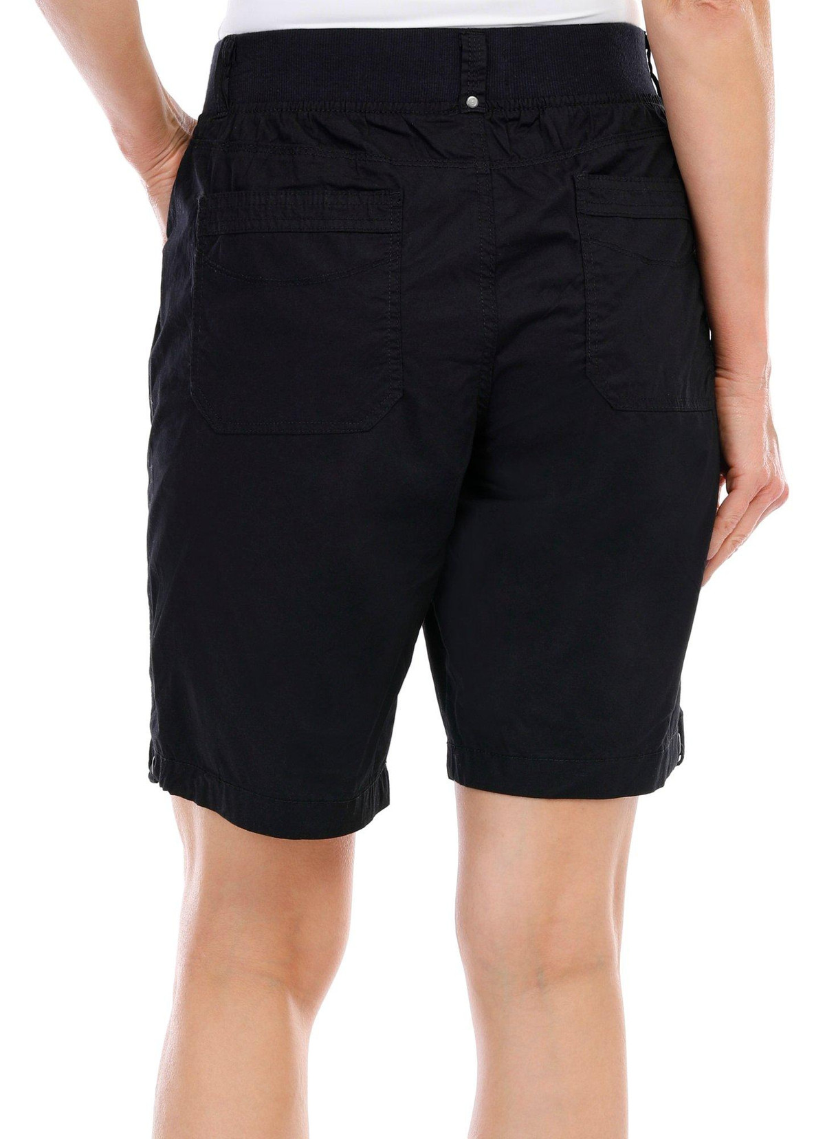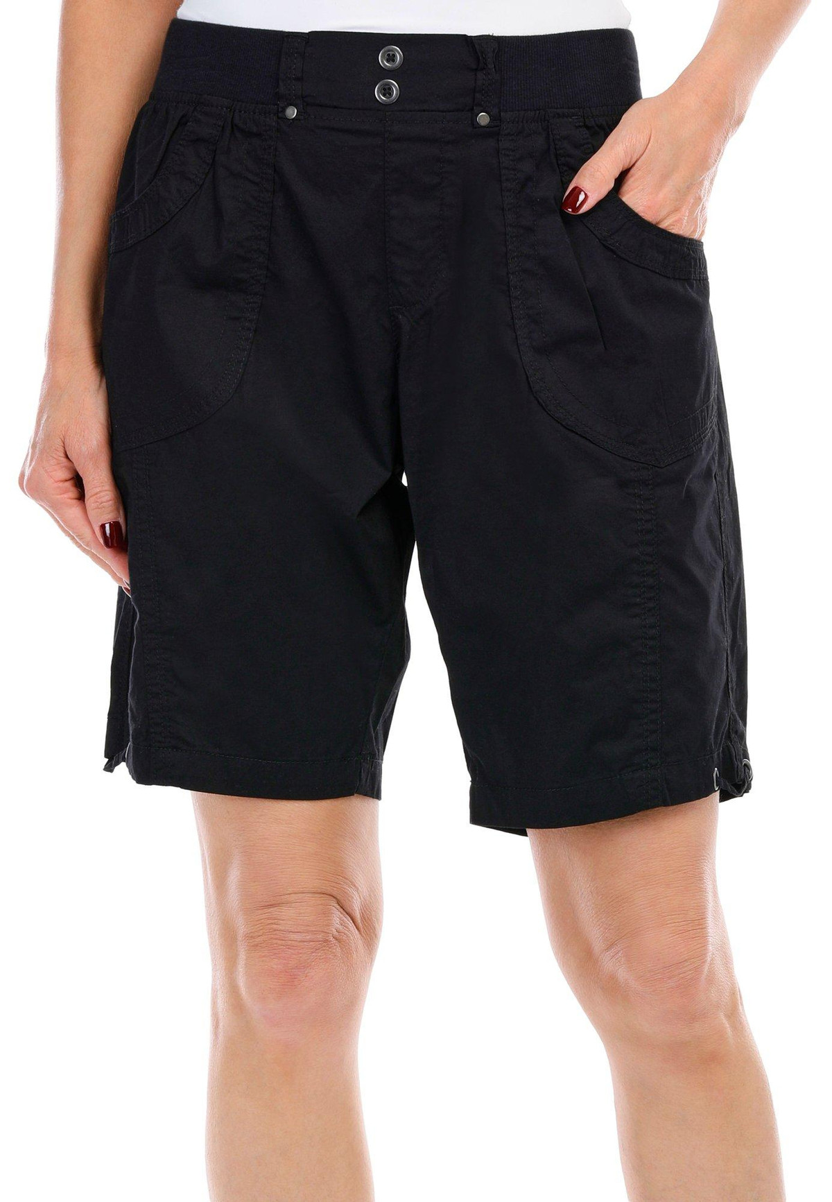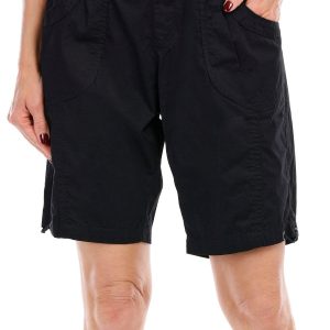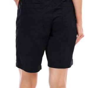 These shorts feature an elastic ribbed waistband with one button closure, two front pockets, two back slip pockets, a drawstring at side hemline, lightweight woven fabric, and a solid color design for effortless matching. Inseam measures approximately 10 in. Outseam measures approximately 20 inches from waistband to hemline. Fabrication is 98% cotton and 2% spandex.