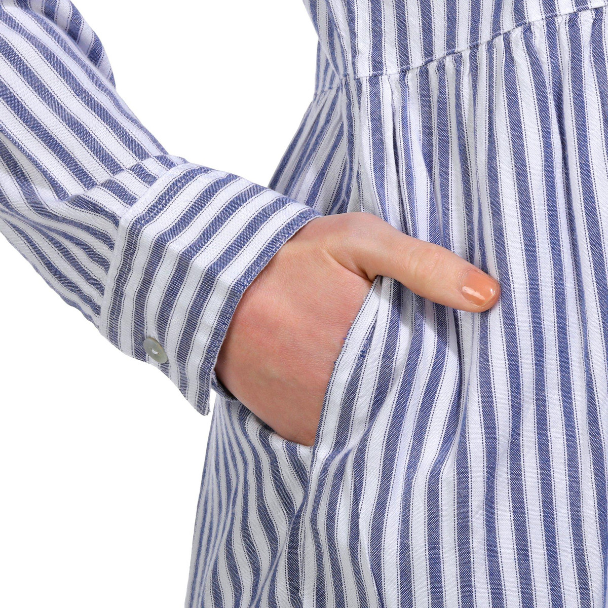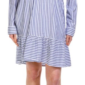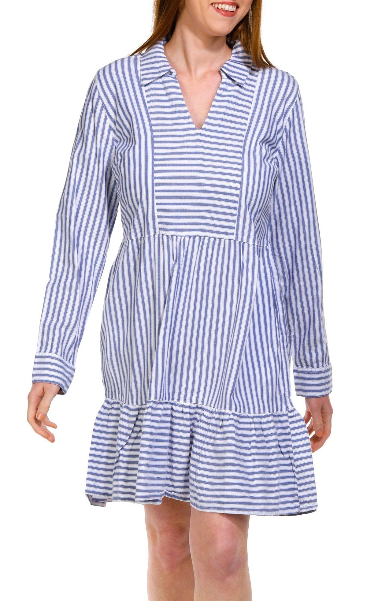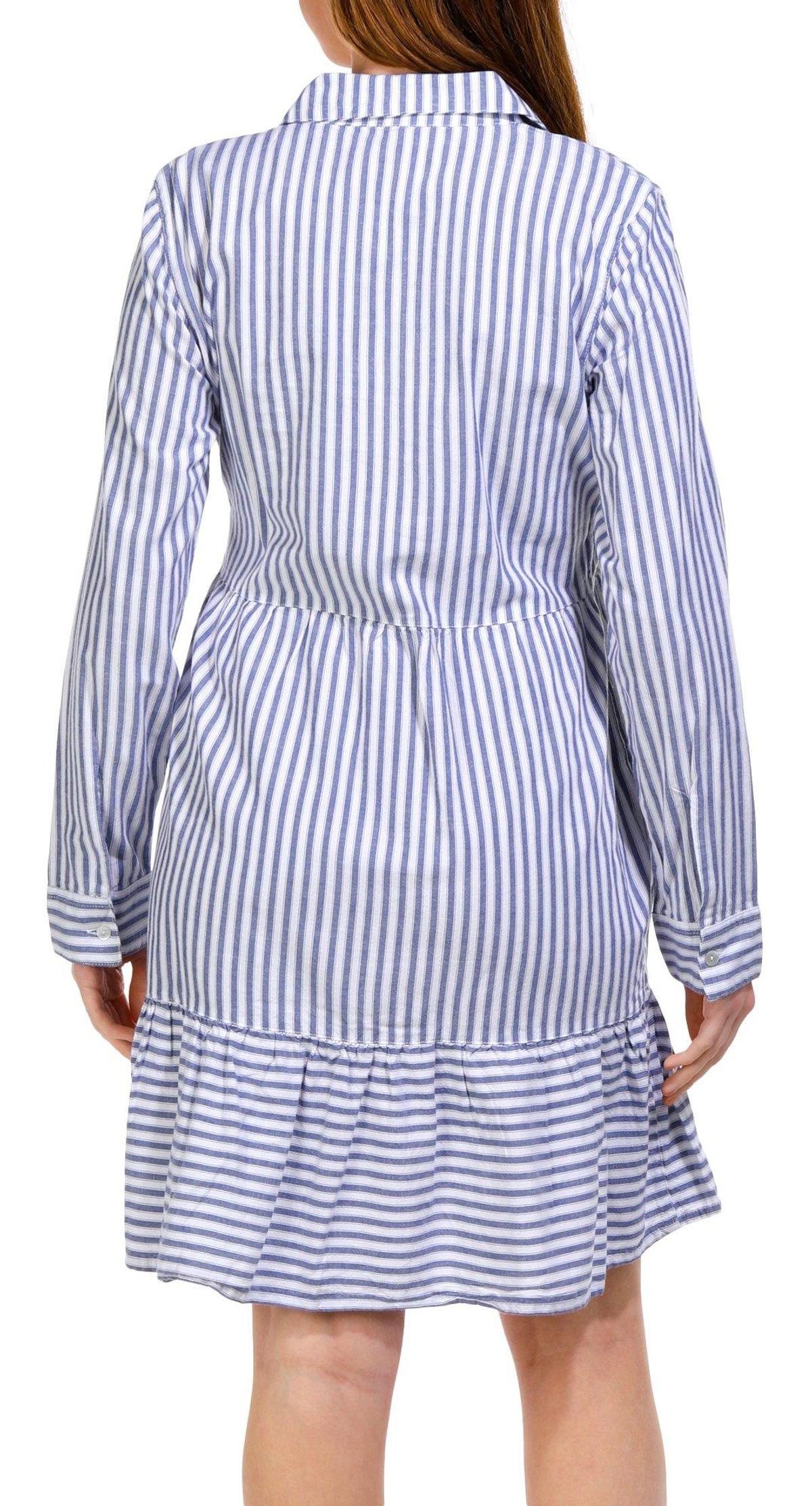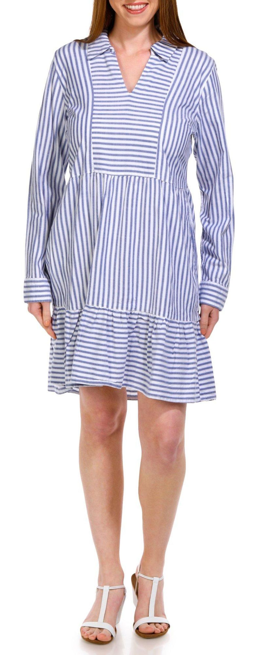 Elevate your wardrobe with this Long Sleeve Swing Dress. Featuring a timeless striped pattern, this dress combines classic style with modern comfort. The flowing silhouette ensures a flattering fit for all body types, while the double side pockets add a practical touch. Perfect for any season, this versatile dress can be dressed up or down for any occasion. Fabrication is 55% cotton, 45% rayon.
