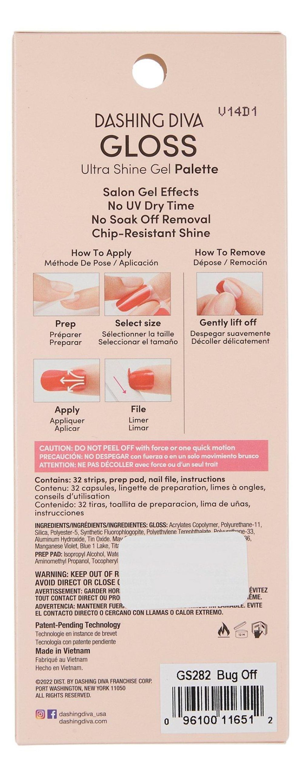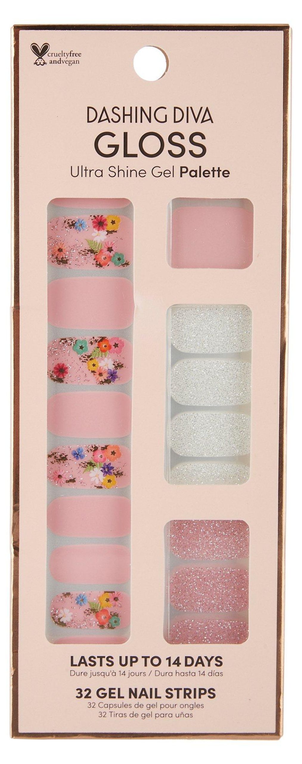 Dashing Diva Ultra Shine Gel Palette 32 Gel Nail Strips features 32 gloss gel nail strips in a variety of designs, no UV dry tmie, salon gel effects, no soak off removal, chip-resistant shine, and lasts up to 14 days. Best used within 12 months of opening. Contains 32 gel nail strips, prep pad, nail file, and instructions.