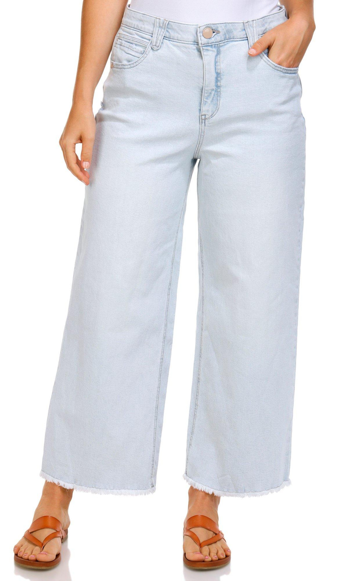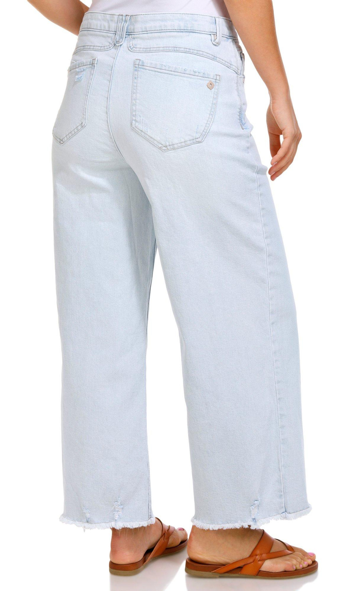Add a relaxed edge to your wardrobe with these Womens 27 inch Wide Leg Boyfriend Jeans. Made from a comfy cotton-spandex blend, they feature a classic 5-pocket cut, button-fly zip closure, wide leg silhouette, and a trendy frayed hemperfect for laid-back, everyday style.