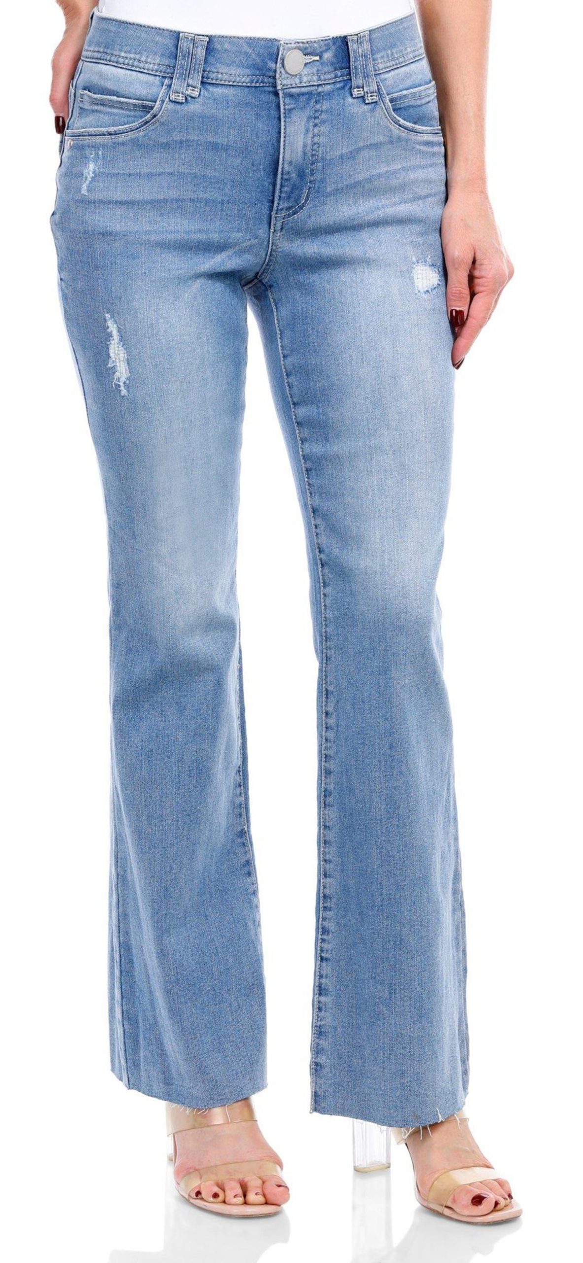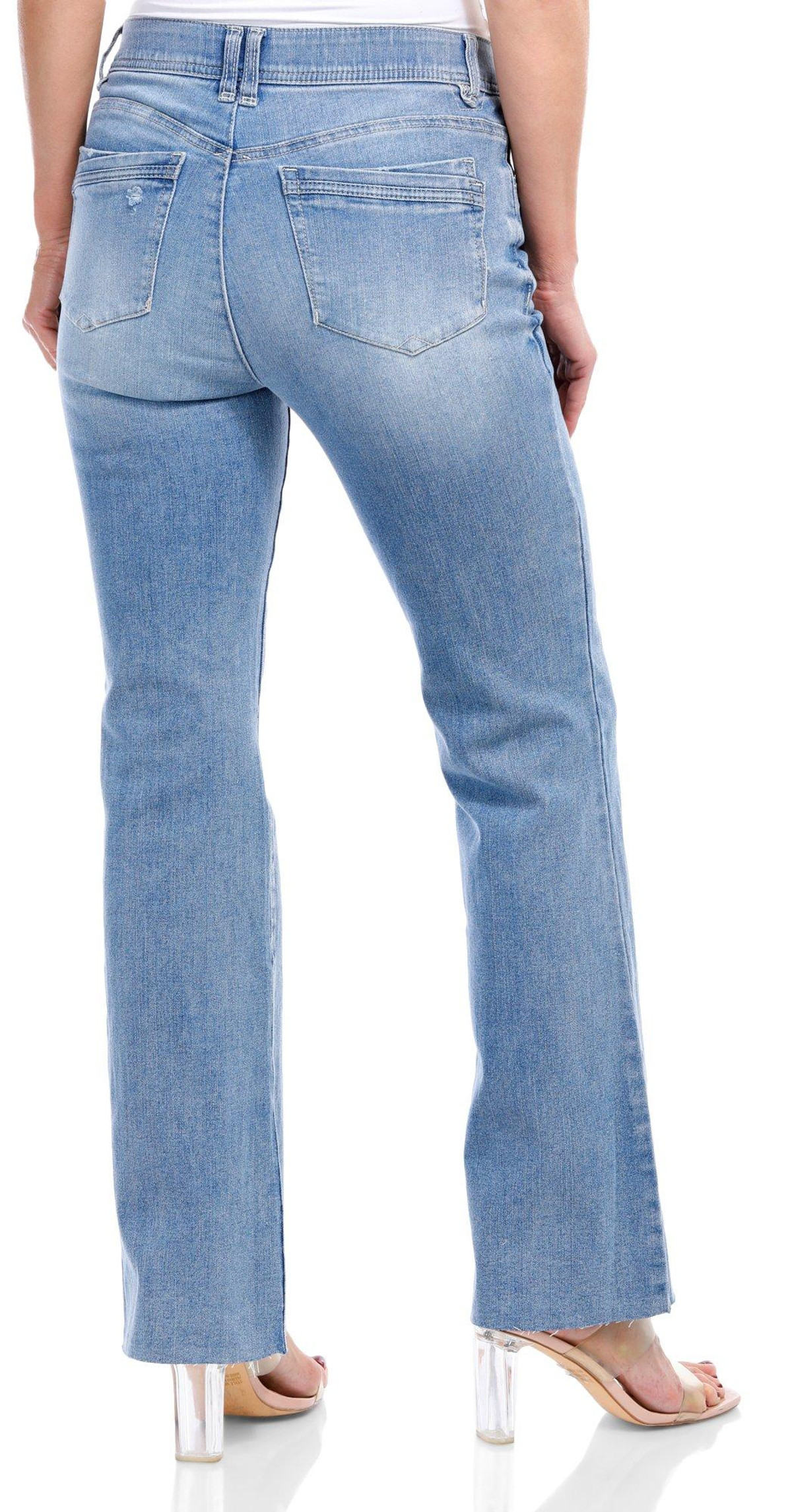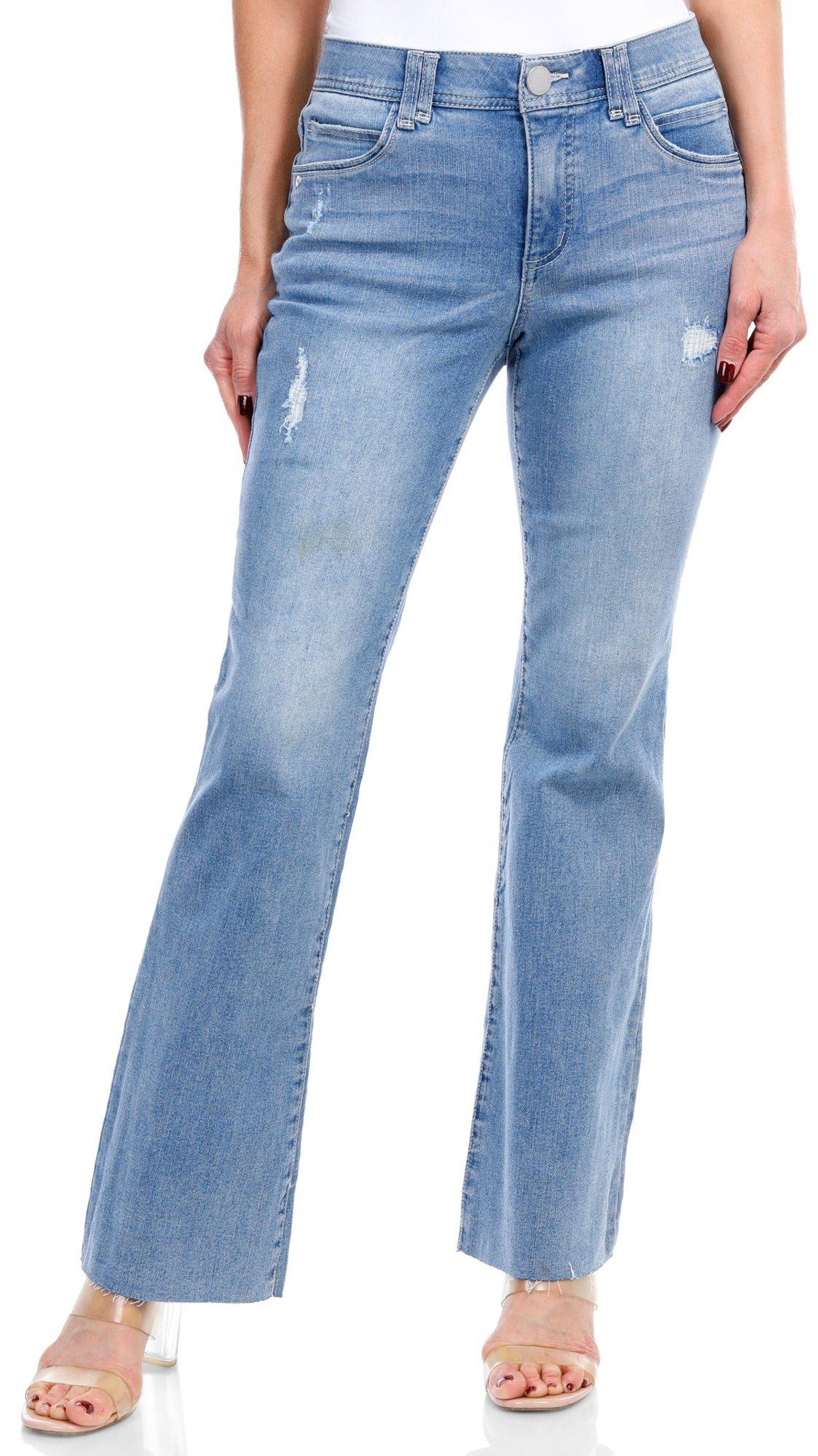 These weekend-ready high-rise Itty Bitty Boot jeans offer a well-worn look with a chic light blue vintage wash, fading, and subtle distressed details. Designed with soft stretchy denim and figure-flattering Ab solution® fit technology that flattens your tummy with interior slimming power mesh panels. Fabrication 85% cotton, 14% polyester, 1% spandex