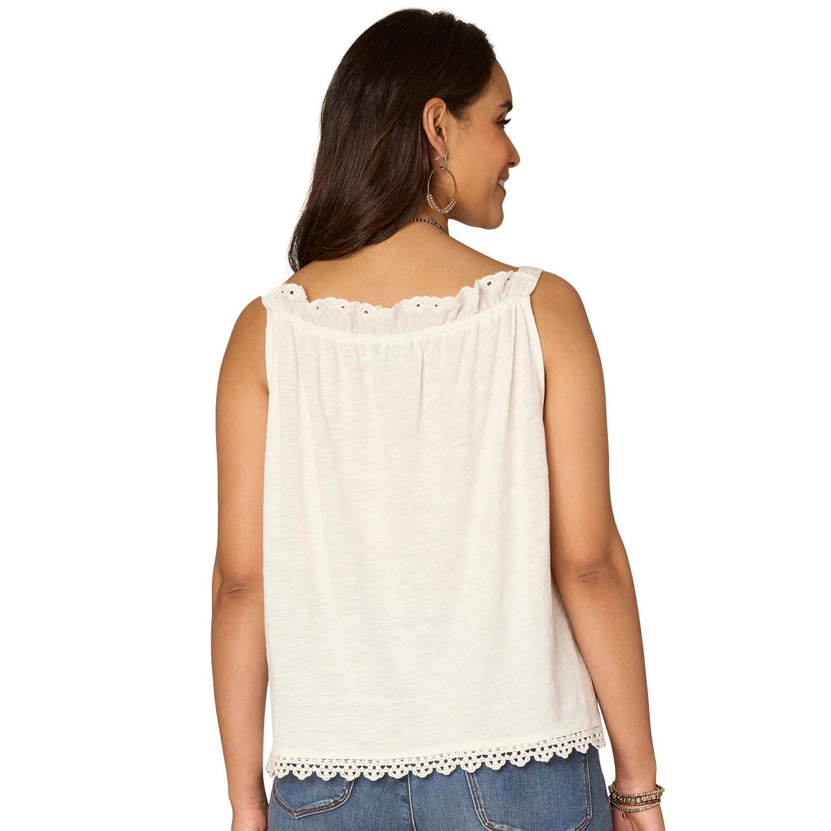 This Womens Democracy ruffles square neck tank top features a flattering square neckline with delicate ruffle details.