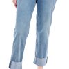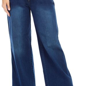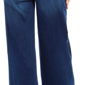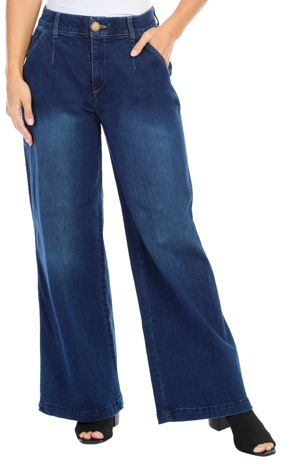 These Democracy jeans feature a solid color design on lightweight denim fabric, one-button and zipper closure, five-pocket styling, wide leg style, and wide hem. The inseam measures approximately 32 in. Fabrication 63% cotton, 23% polyester, 14% spandex.