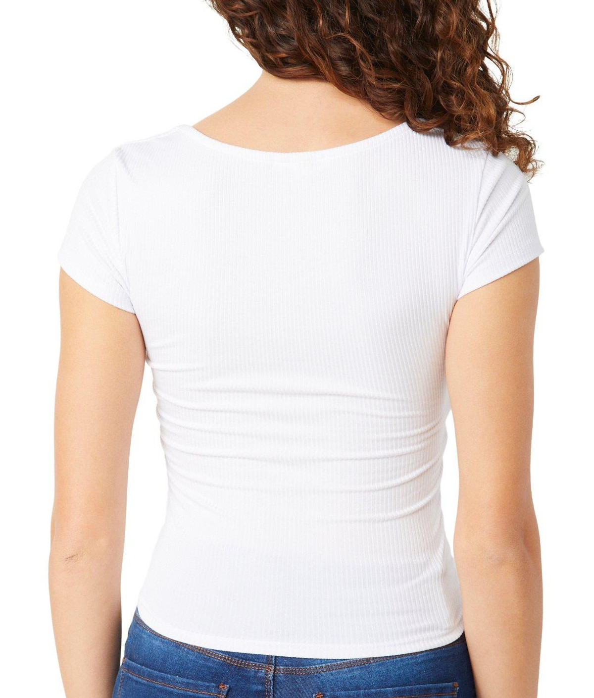 Upgrade your outfits with this simple and stylish short sleeve top! It features a ribbed fabric, scoop neckline, and a washed-style solid color design. The styling opportunities are endless! Fabrication is 92% polyester and 8% spandex.