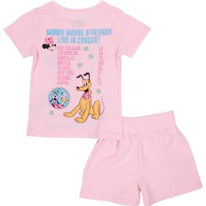 This 2 piece set features a short sleeve with Minnie Mouse screen print, crew neckline, Rhinestones, and a matching elastic waist Minnie Mouse pocket free twill short.