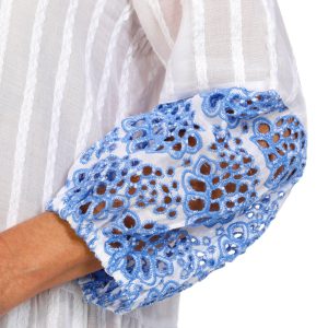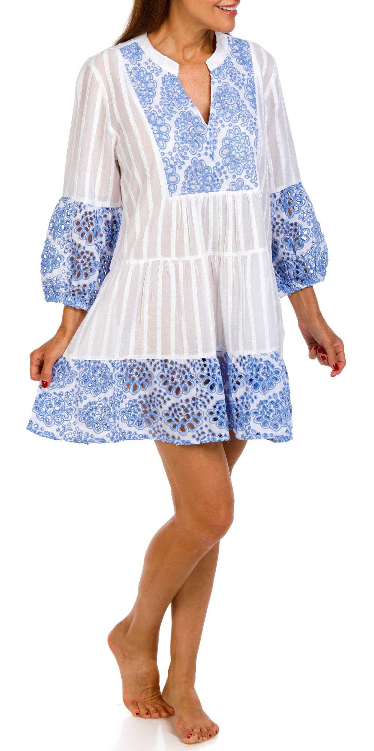 Brighten beach days with a breezy tiered cover-up made from sheer, lightweight cotton for easy layering. Designed with 3/4 cuffed bell sleeves, a tunic style neckline and delicate blue embellishment detailing, it adds a touch of coastal charm and laid-back elegance. Perfect over swimwear, it provides just enough coverage while keeping your look effortlessly cool and beach-ready. Fabrication is 100% cotton. Measures approximately 33 in length.