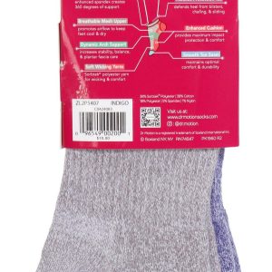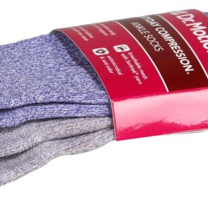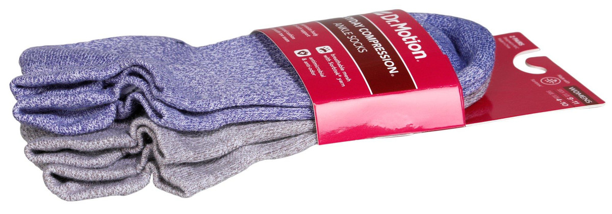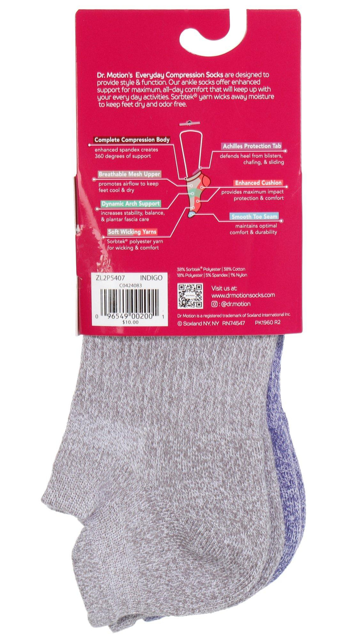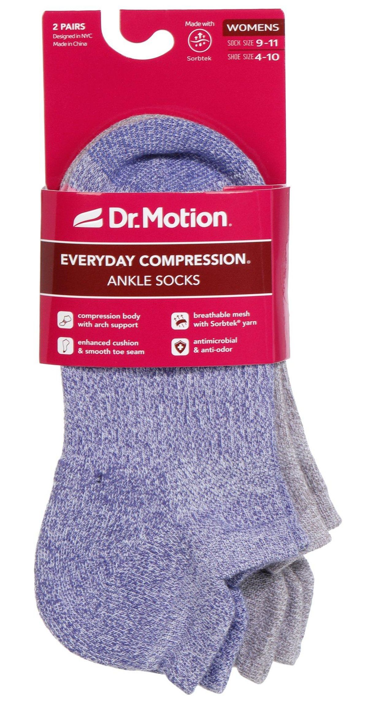 Dr. Motion women’s compression ankle socks in a 2-pair pack feature one blue and one grey design. Sized for sock size 911 and shoe size 410, these socks offer a complete compression body with dynamic arch support, enhanced cushioning, and a smooth toe seam. Made with breathable mesh and Sorbtek yarn, they wick moisture and include antimicrobial and anti-odor propertiesperfect for everyday comfort and performance.