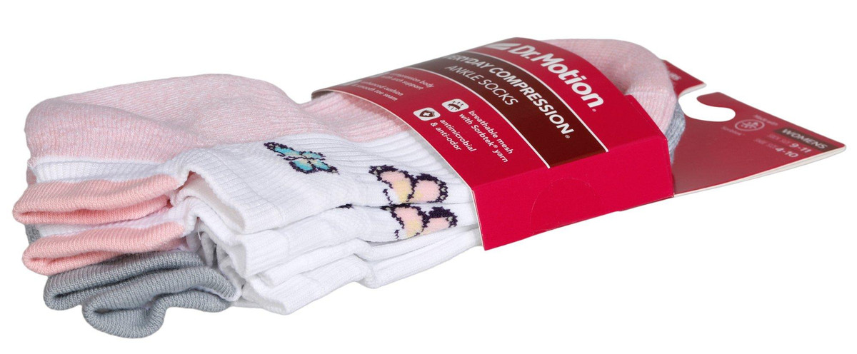 Dr. Motion women’s compression ankle socks come in a 2-pair pack (grey and pink with butterfly design), sized 911 sock and 410 shoe. Features include 360° compression, arch support, breathable mesh with wicking yarn, antimicrobial and anti-odor tech, ankle tabs with reflective logo, Y-heel fit, cushioned cotton heel/toe, and reinforced smooth toe. Fabric: 50% Nylon, 29% Cotton, 13% Polyester, 8% Spandex.