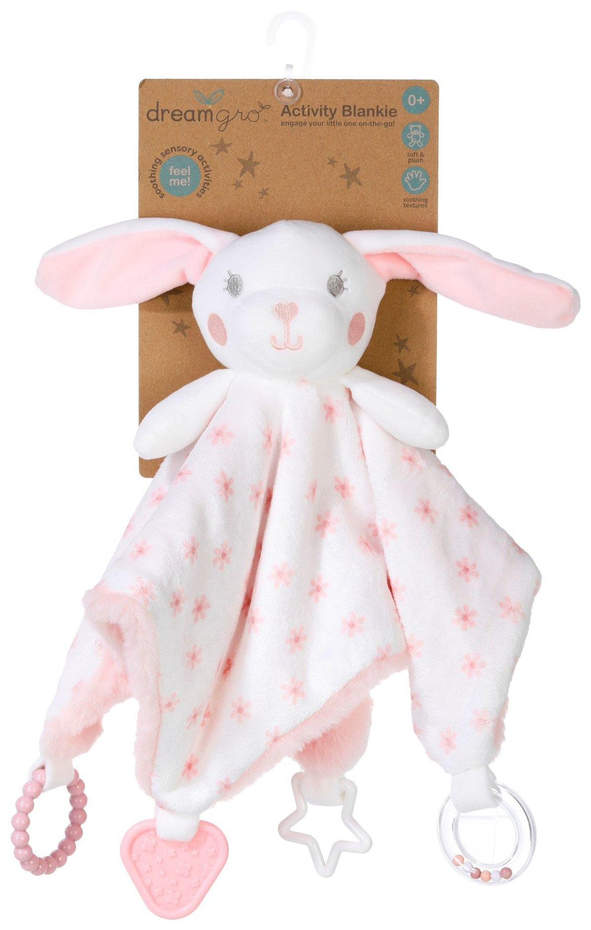 This 15-inch bunny activity blankie features a soft pink design with floral accents, crafted to soothe and engage babies through sensory play. It includes a gentle rattle, textured teether, and a grip ring to support tactile exploration and teething relief. Ideal for newborns and up, the plush bunny offers crinkly textures and comforting softness, making it a perfect companion for snuggles, playtime, or trave