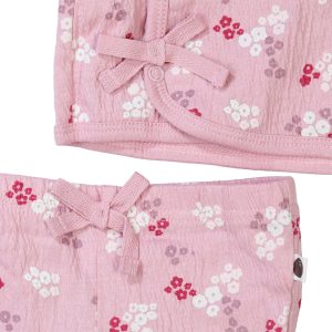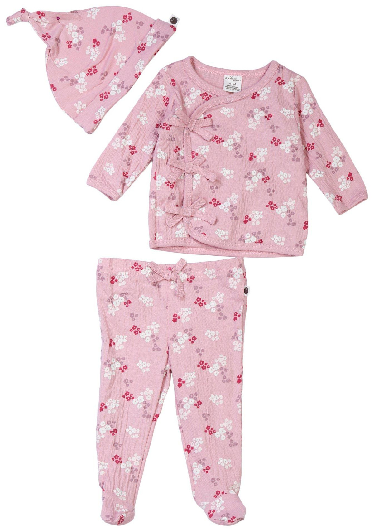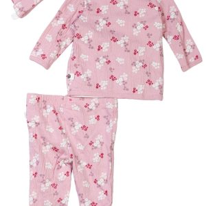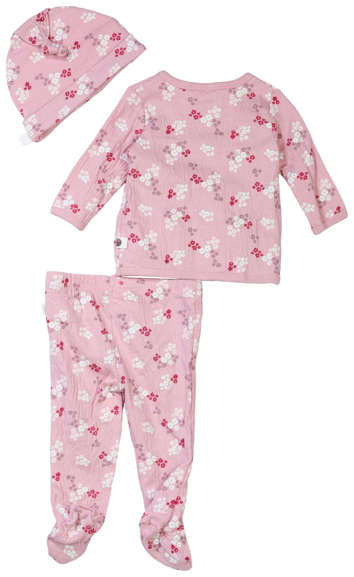 Keep her cozy in coordinated style with this Baby Girls 3 Piece Long Sleeve Cardigan Pant & Hat Set. Made from a soft cotton, polyester, and spandex blend, the set features a purple floral pattern across the long sleeve cardigan, matching footed pants, and hat. Perfect for layering during cooler days. Machine wash cold for easy care.