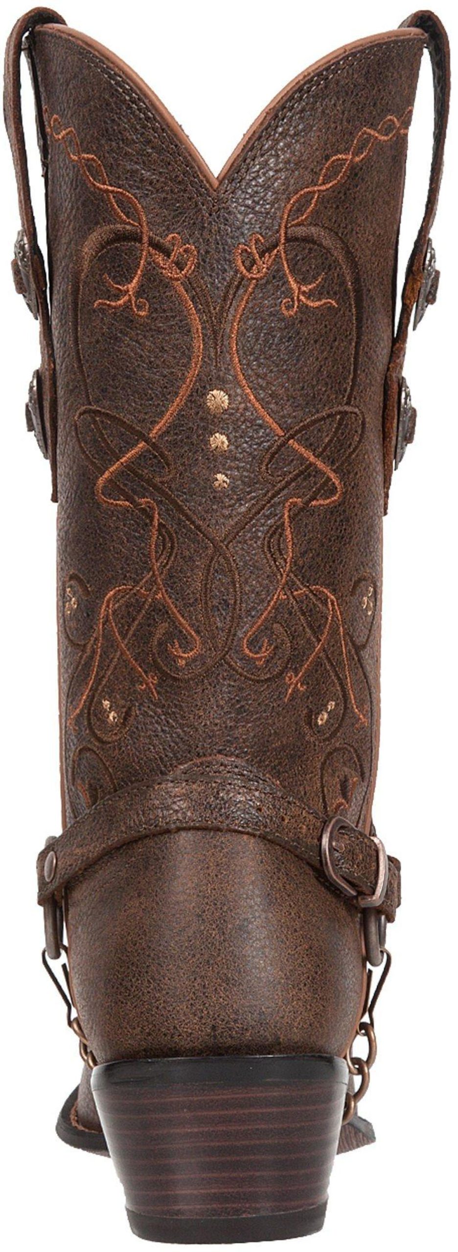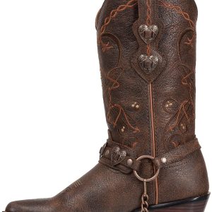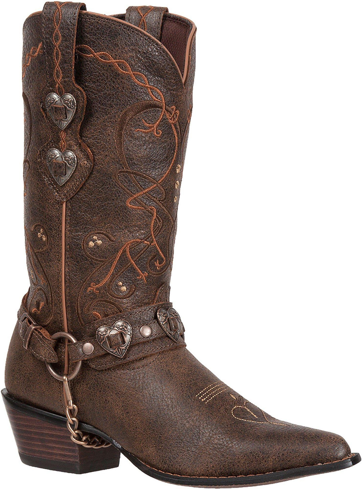 The Heart Buckle cowboy boots by Durango offer a full-grain genuine leather upper with smooth filigree finishing and heart-shaped metal accents. These boots offer a cushion flex insole, tempered steel shank, and a soft mesh lining. Boot shaft measures 11” tall.