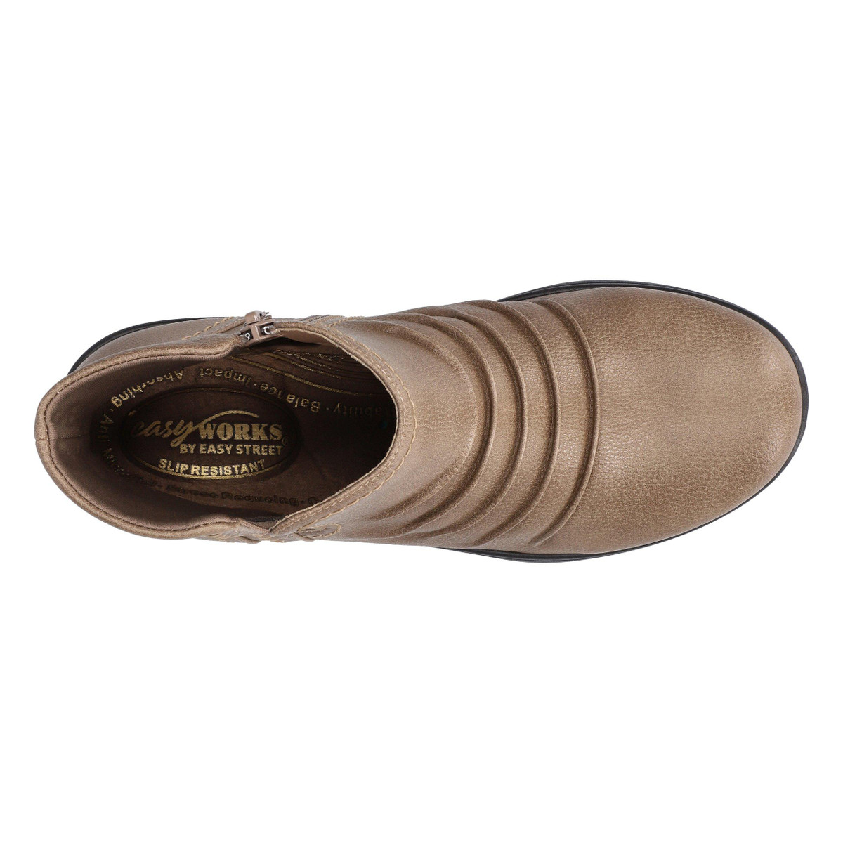 The Autumn from Easy Works by Easy Street is a stylish ruched comfort bootie with stitch detailing that will meet all your fashion needs. Enhanced with the Easy Motion Pro Comfort system, the removable antimicrobial contoured insole is designed to provide all-day comfort and support. Featuring stretch-for-fit comfort and an on-trend mini lug non-marking slip-resistant outsole, this style will have you pairing with all your favorite casual outfits.