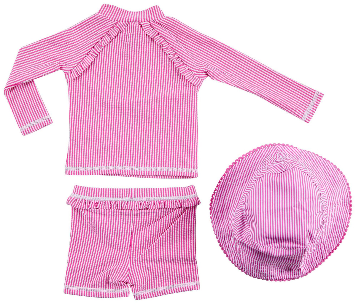 Introducing the Baby Girls 3 Pc Striped Rash Guard Swim Set, made from a durable blend of polyester and spandex for comfort and flexibility. This stylish set includes a long sleeve quarter zip rash guard, shorts, and a hat, all featuring a vibrant stripe print. Perfect for beach days or poolside fun, this swim set offers excellent sun protection and ensures your little one stays comfortable and fashionable while enjoying water activities.